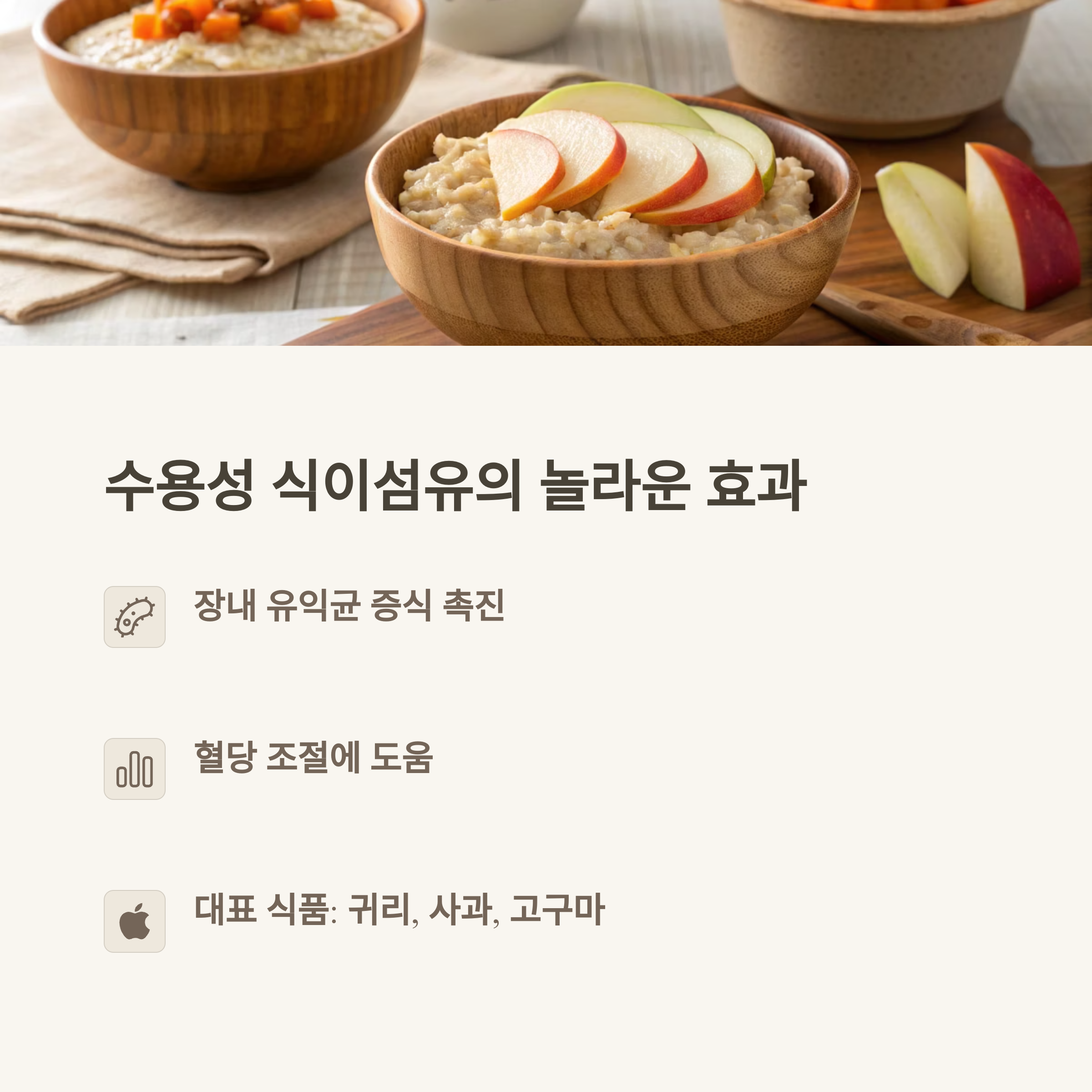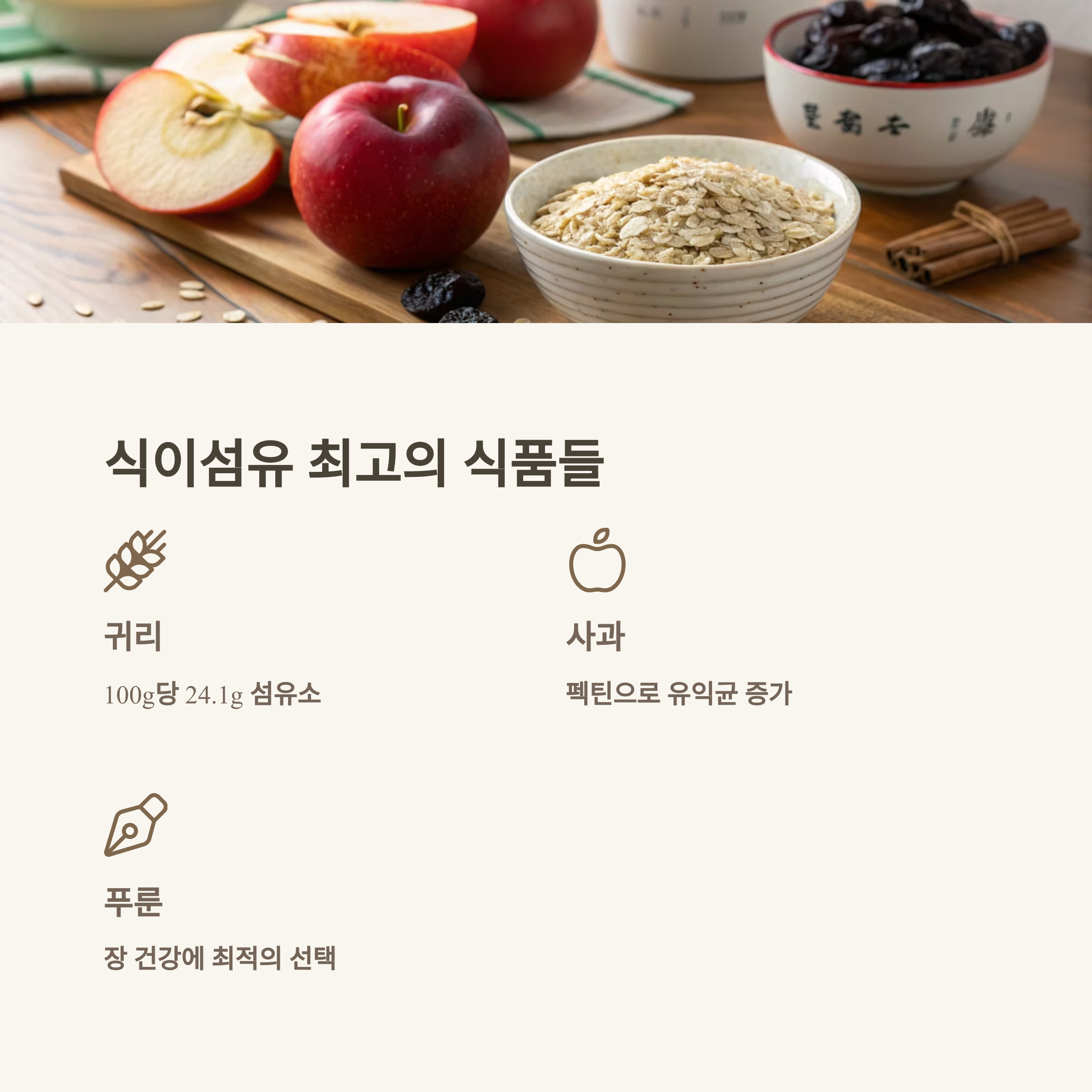 | 귀리 | 24.1g/100g | 장 운동 촉진, 혈당 조절 |