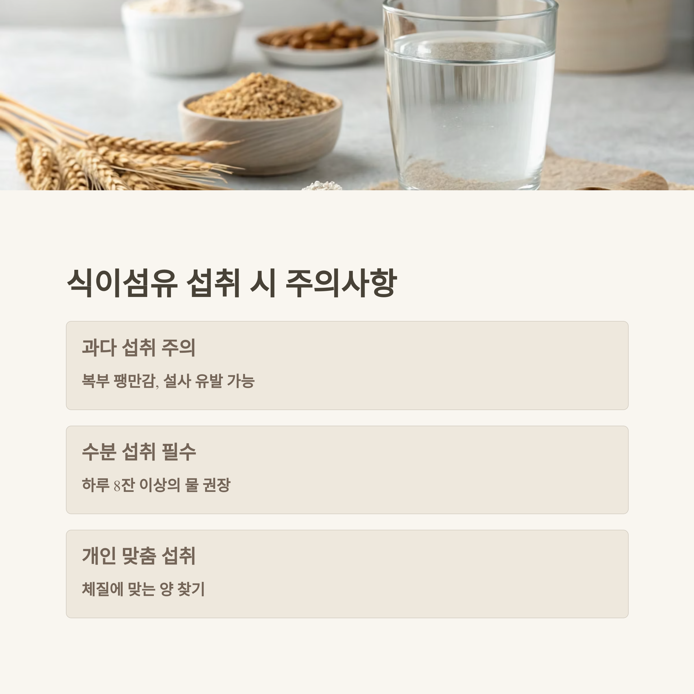 과도한 섭취는 오히려 복부 팽만감이나 설사를 유발할 수 있어요. 물과 함께 적정량 섭취하는 게 중요합니다.