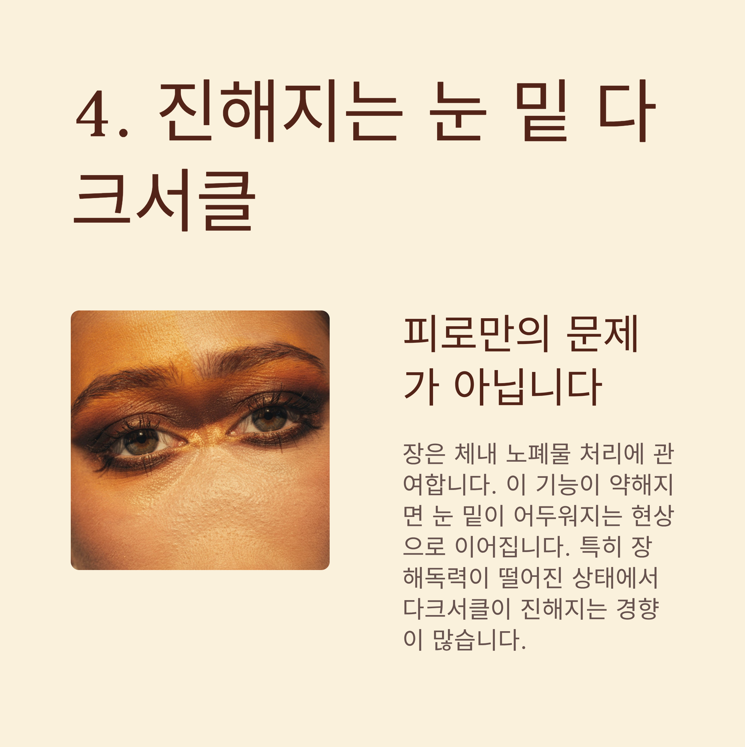 장은 체내 노폐물 처리에 관여하는데, 이 기능이 약해지면 눈 밑이 어두워지는 현상으로 이어질 수 있어요.