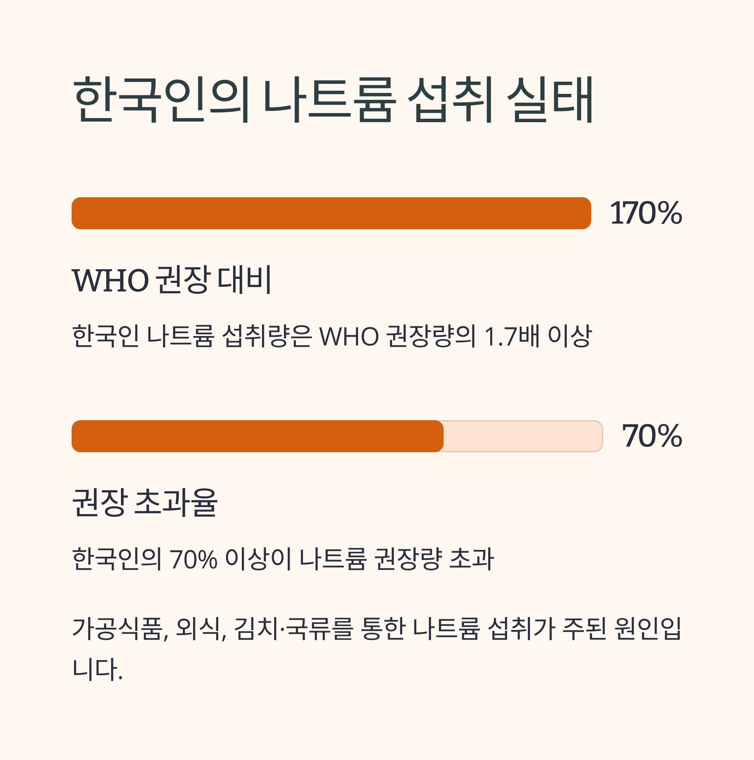 특히 가공식품과 외식, 김치·국류를 통한 나트륨 섭취가 주된 원인이며,