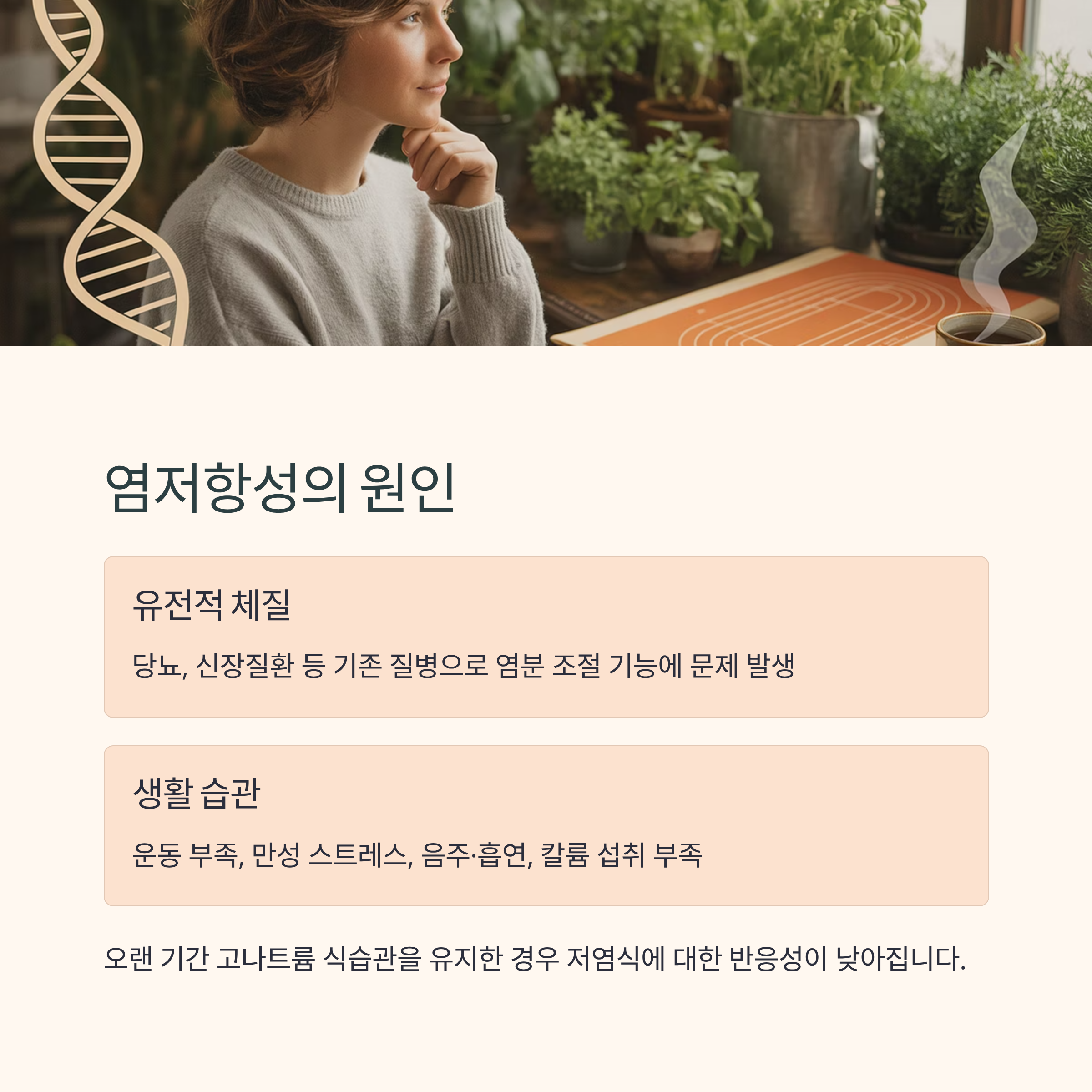 | 염저항성 | 48%~50% | 저염식에 반응 없음 | 유전, 신장 질환, 운동 부족 |