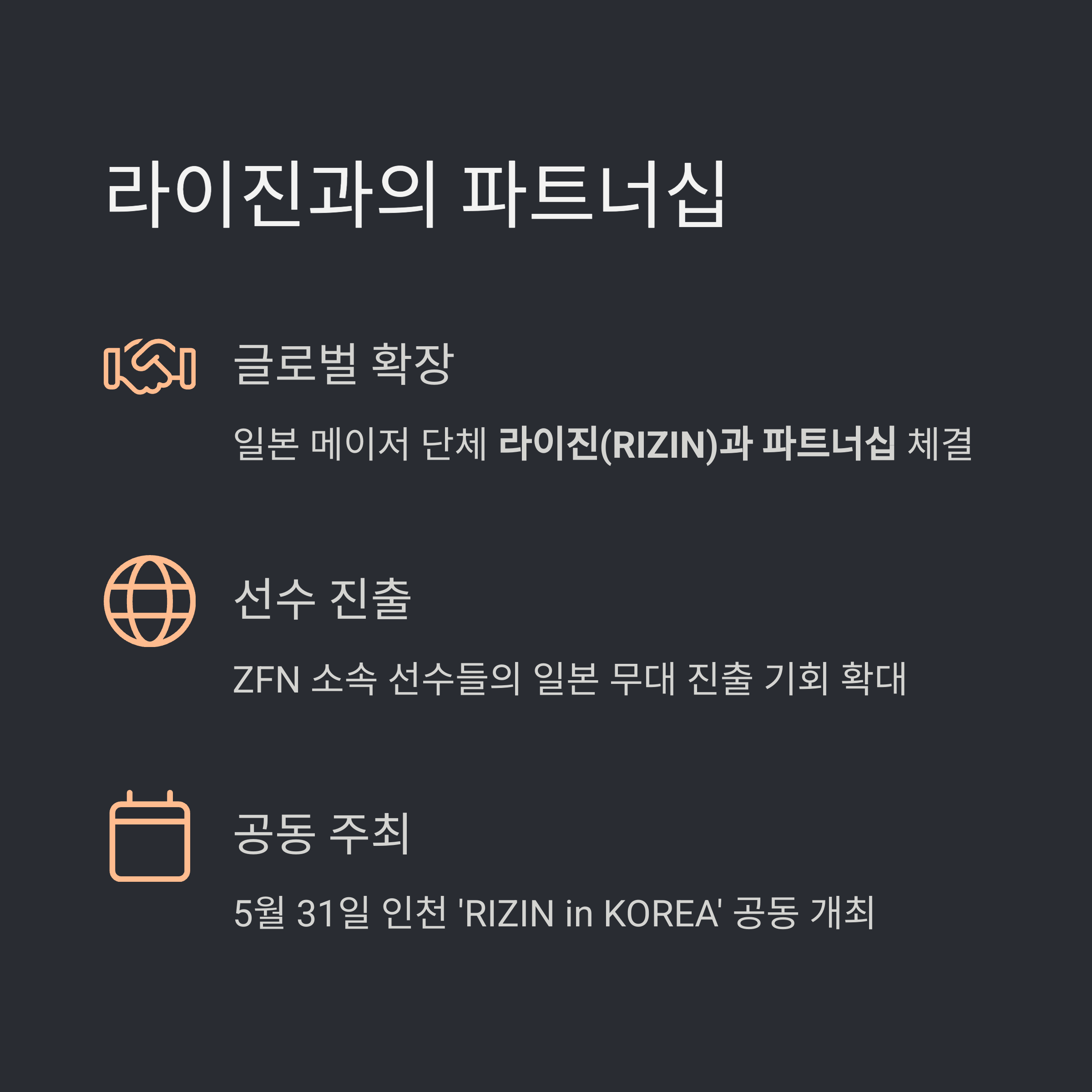 | 국제 파트너십 발표 | RIZIN 및 UFC와의 제휴 | 국내 MMA의 글로벌화 |