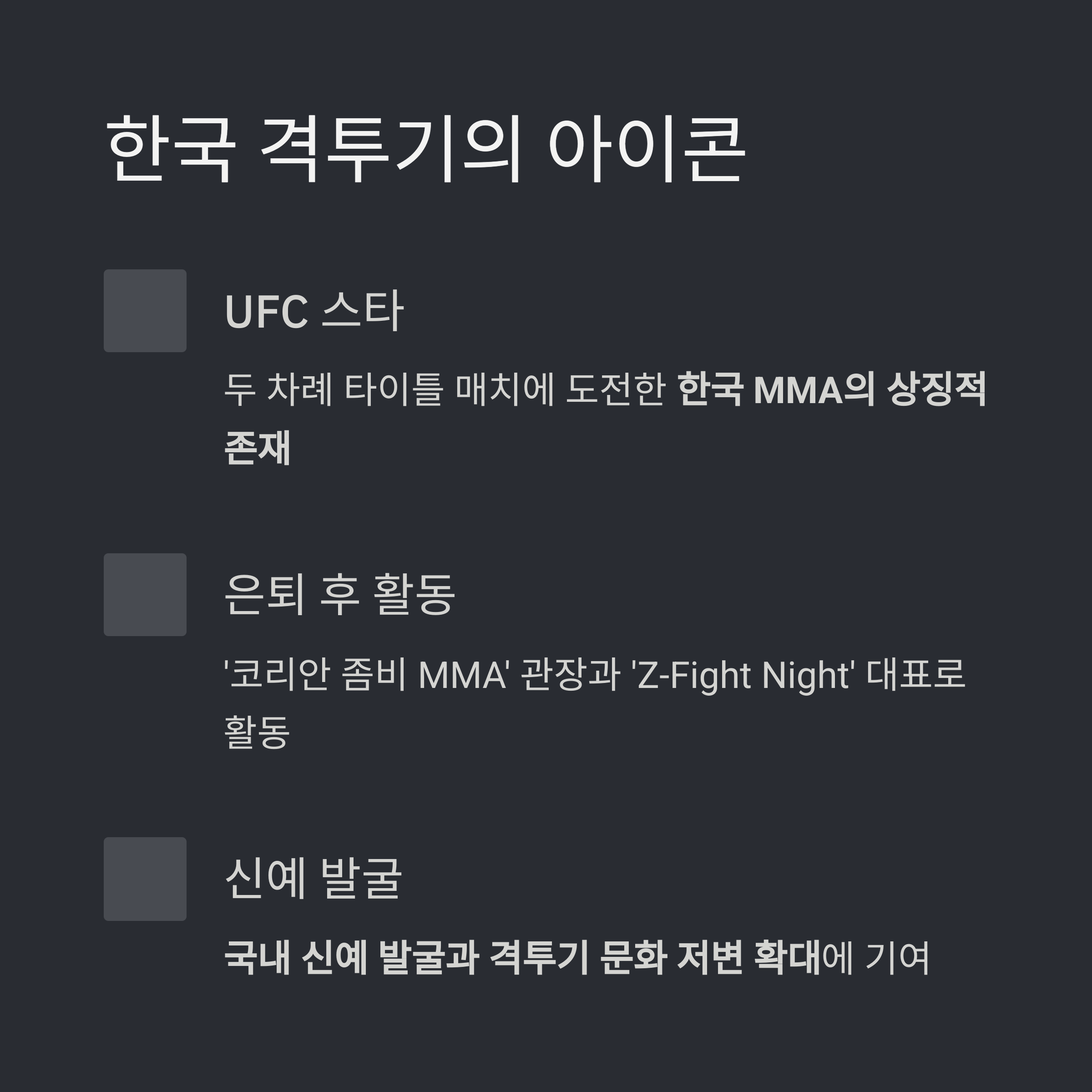 한국 MMA의 상징적 존재로 자리매김한 파이터입니다.