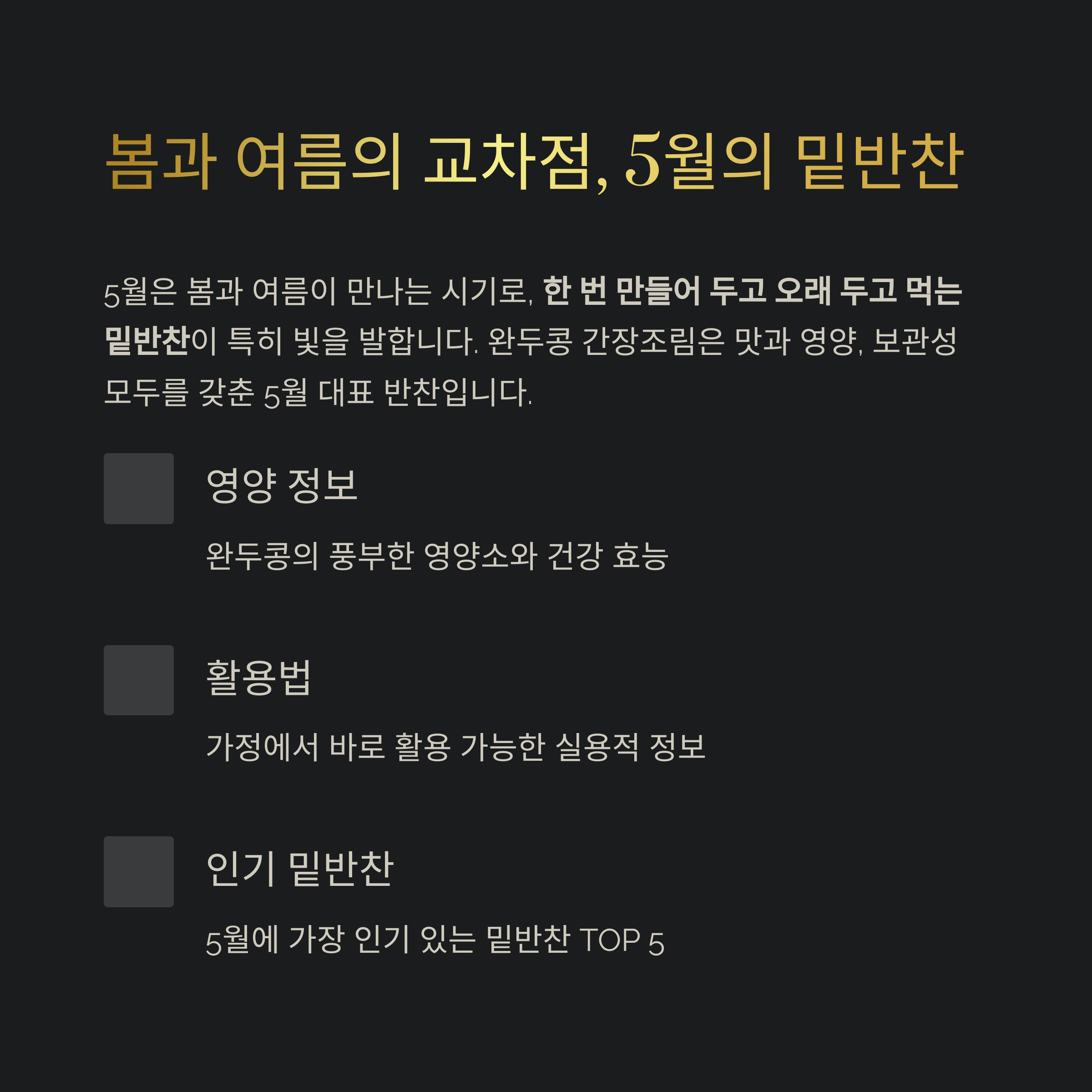 5월 밑반찬은 제철 재료의 풍미와 건강을 동시에 챙길 수 있는 효율적인 선택입니다.