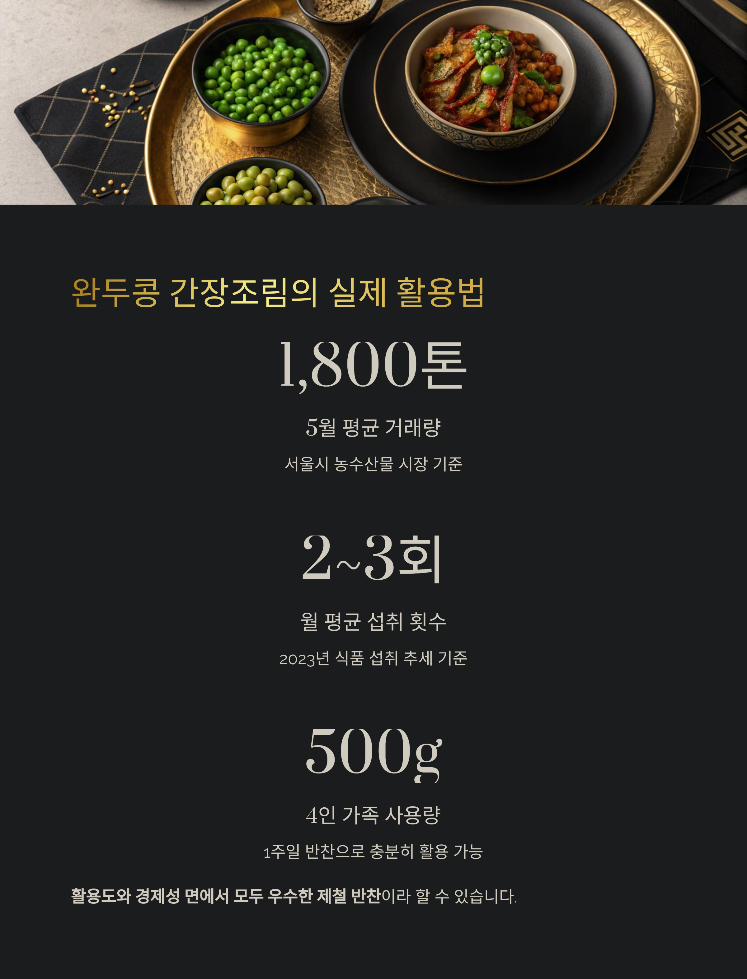 2023년 식품 섭취 추세에 따르면, 한 가구당 완두콩 간장조림 섭취 횟수는 월 2회에서 3회이며,