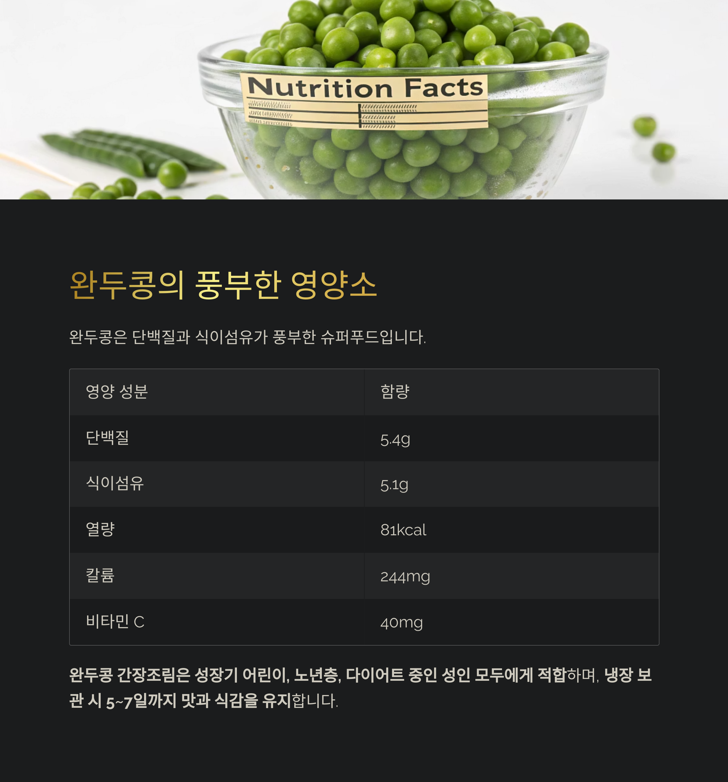 아래 표는 100g 기준 완두콩의 주요 영양 성분입니다.