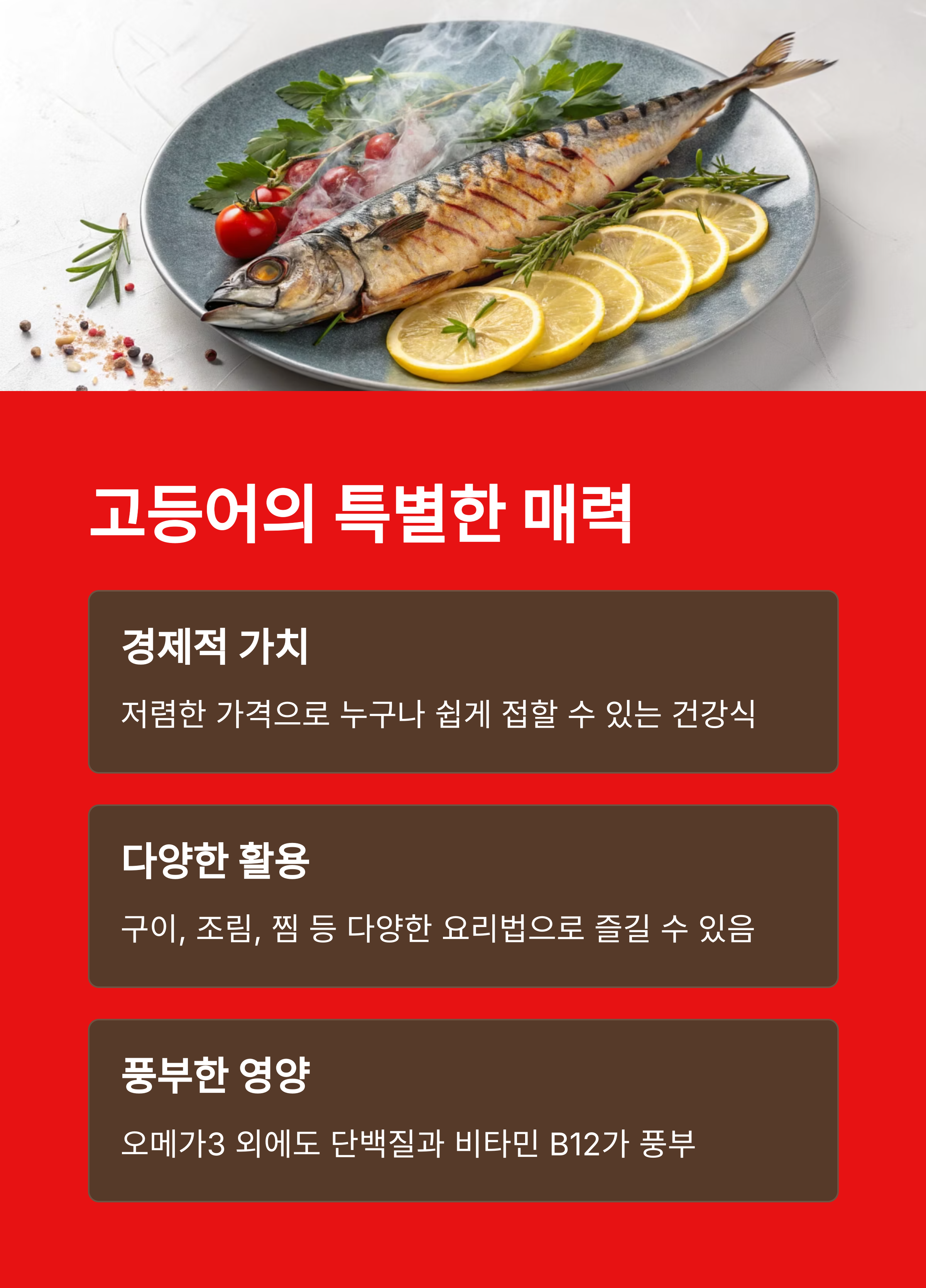 고등어는 오메가3 함량이 높고 가격이 상대적으로 저렴하여 경제적인 장점이 있습니다. 연어는 비타민 D와 셀레늄이 풍부하여 면역력 향상에 도움이 됩니다. 두 가지 모두 훌륭한 선택입니다.