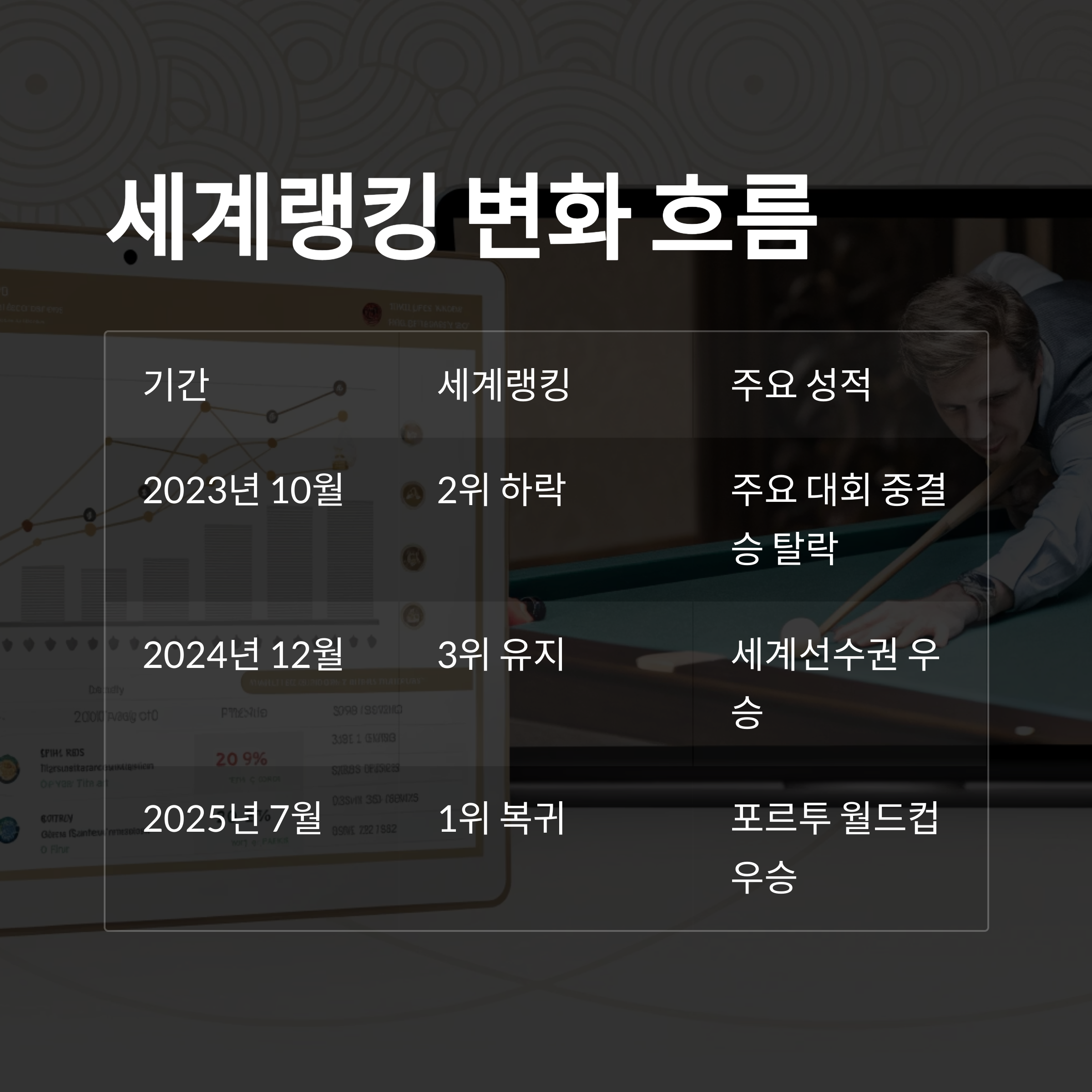 세계3쿠션 무대에서 그의 기술과 정신력을 다시 한 번 입증한 결과입니다.