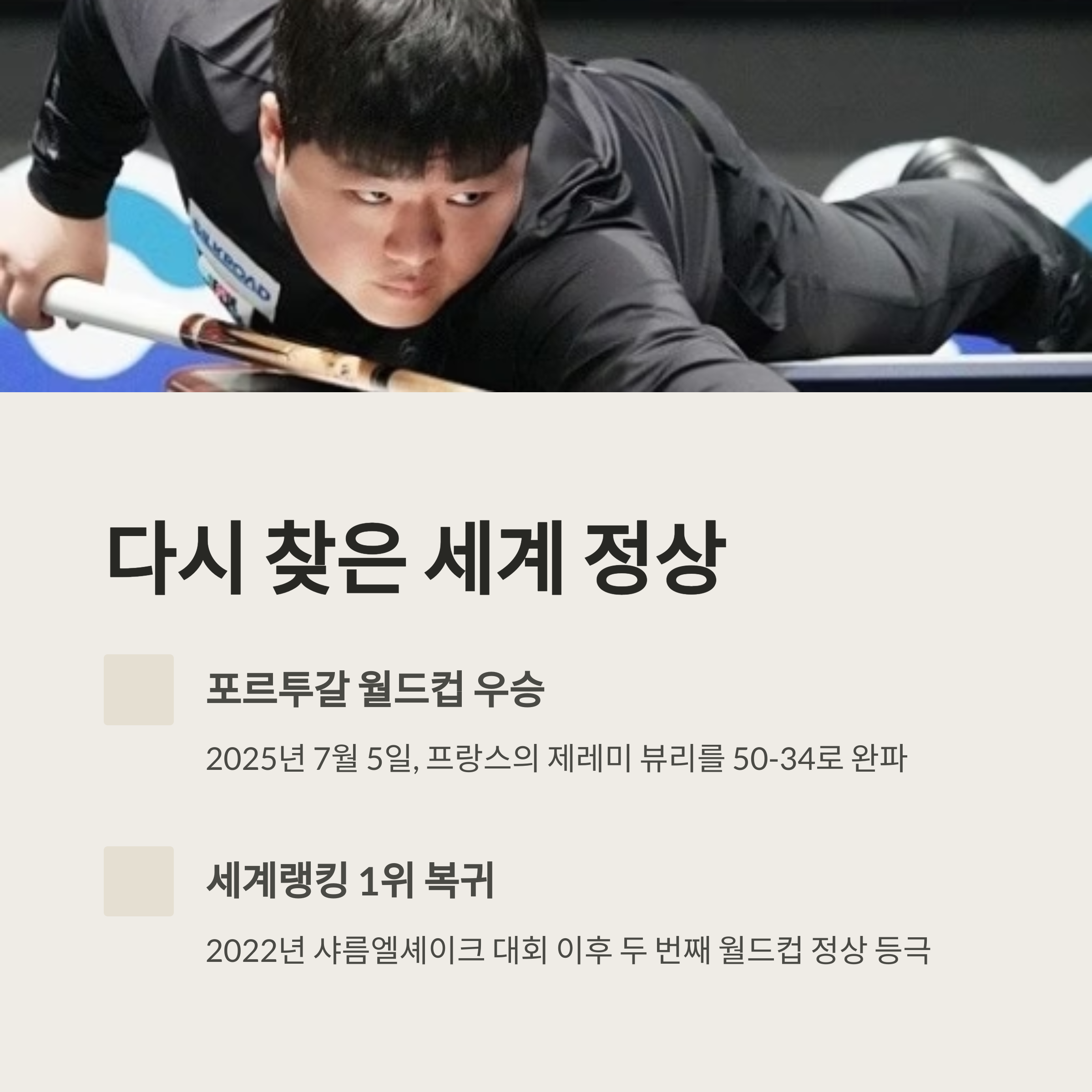 2025년 7월 5일, 포르투갈 포르투에서 열린 세계3쿠션 당구월드컵에서 대한민국의 조명우(서울시청)가 프랑스의 제레미 뷰리(세계랭킹 9위)를 상대로 50-34(23이닝)의 완승을 거두며 극적인 우승을 차지했습니다. 이번 우승은 2022년 샤름엘셰이크 대회 이후 두 번째 월드컵 정상 등극이며, 세계랭킹 1위 복귀라는 쾌거까지 더해졌습니다.