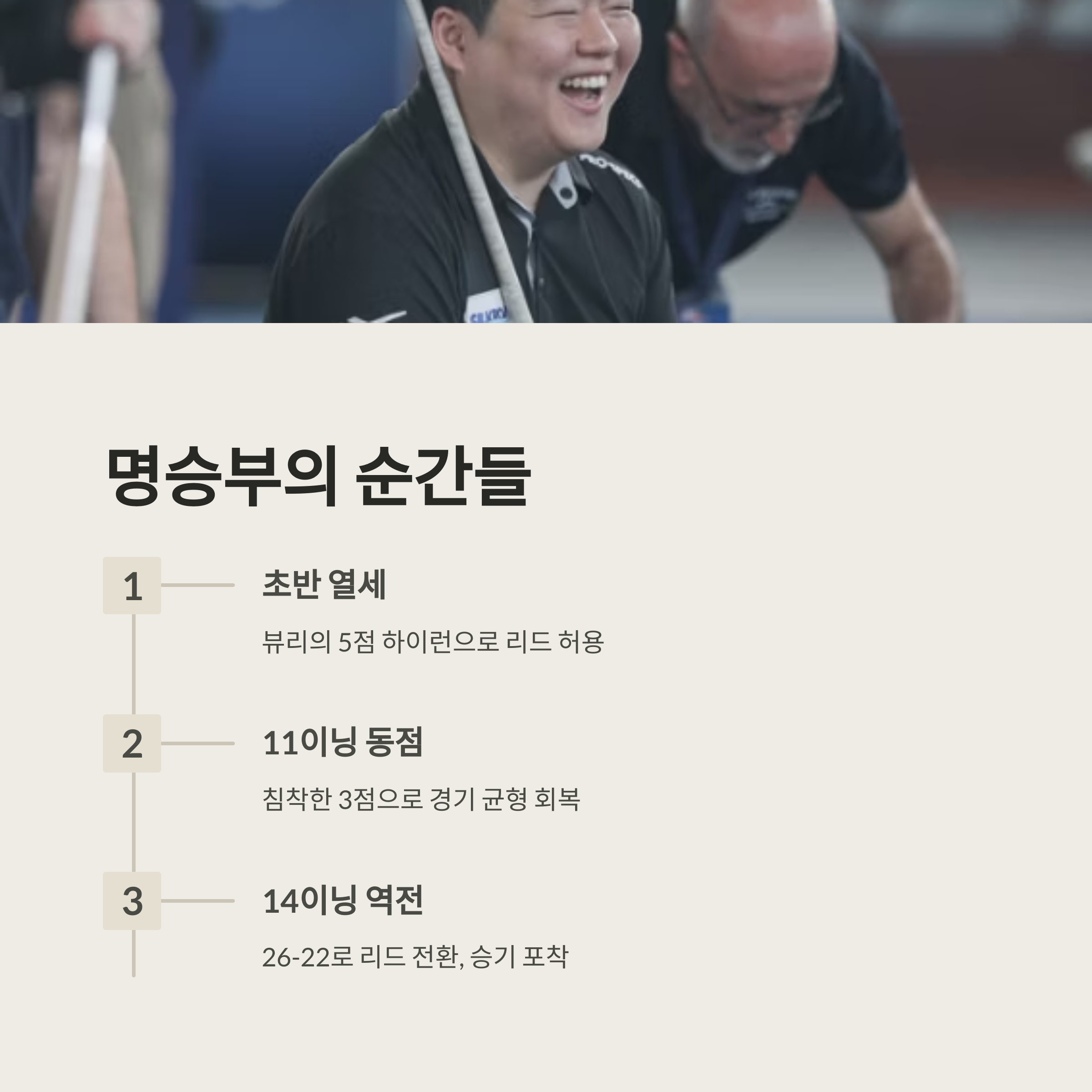 결승전 초반은 뷰리의 페이스였습니다. 두 차례 5점 하이런으로 리드를 잡으며 앞서갔지만,