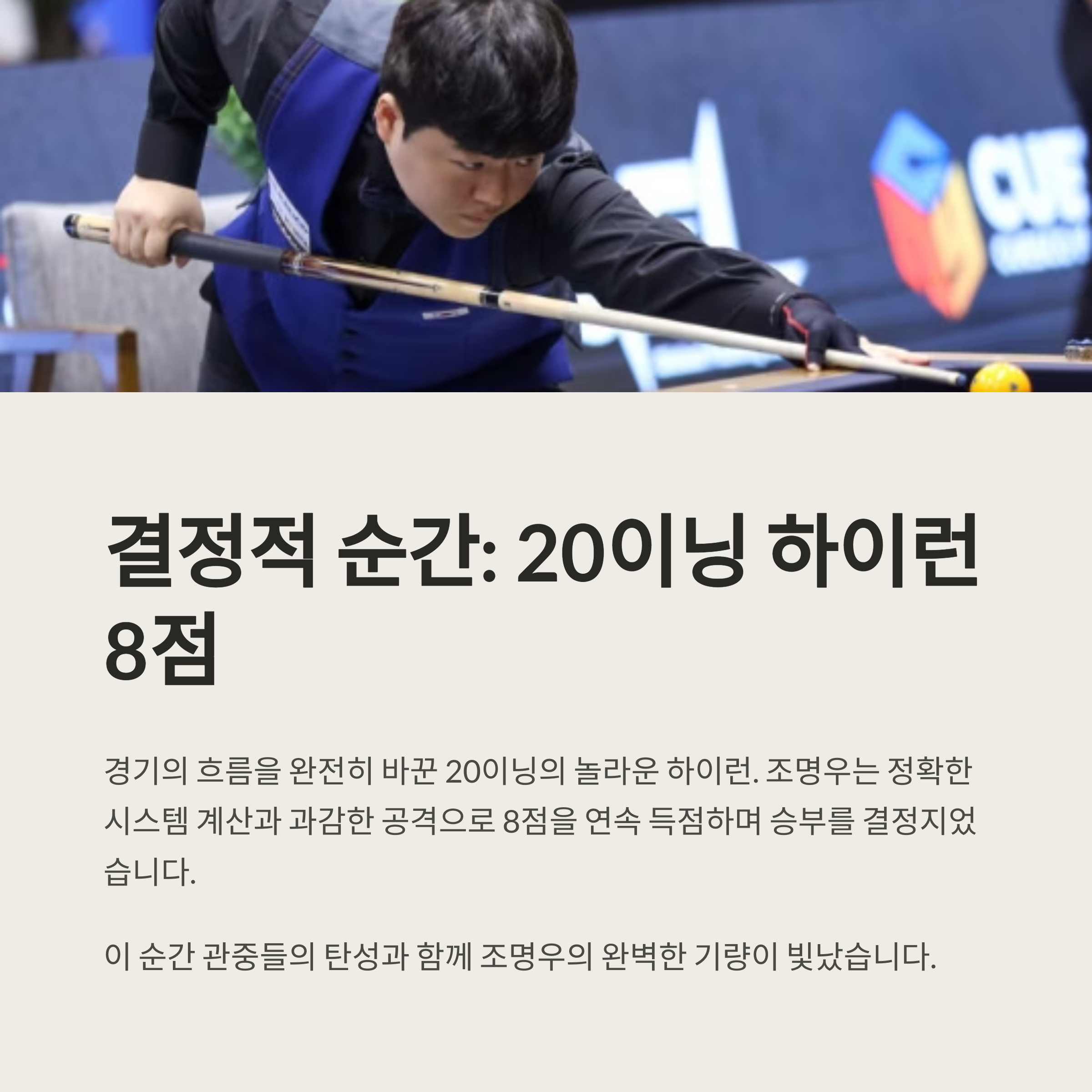 그 순간은 관중들의 탄성과 함께 조명우의 기량이 완벽히 발휘된 장면으로 남았습니다.