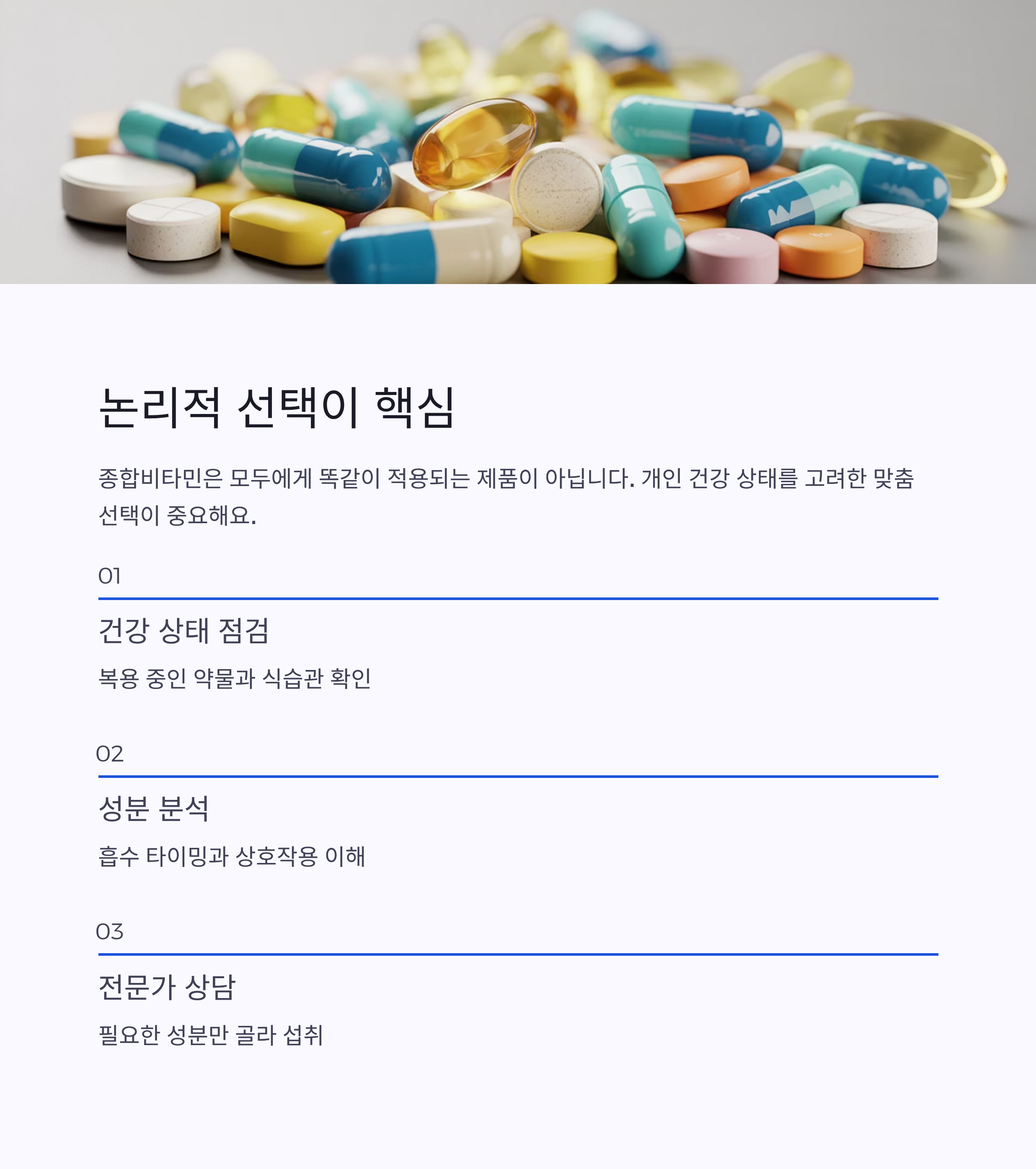 하루 한 알로 건강을 챙길 수 있다는 기대감에 많은 분들이 종합비타민을 찾고 계시죠. 하지만 모든 영양소가 함께 들어 있다고 해서 무조건 좋은 것만은 아닙니다. 성분 간의 충돌, 흡수율 문제, 그리고 개인의 건강 상태에 따라 예상치 못한 부작용도 생길 수 있습니다. 이 글에서는 종합비타민의 성분 조합과 관련된 주의사항, 최신 연구 동향까지 함께 살펴보며 보다 합리적인 선택을 도와드립니다.