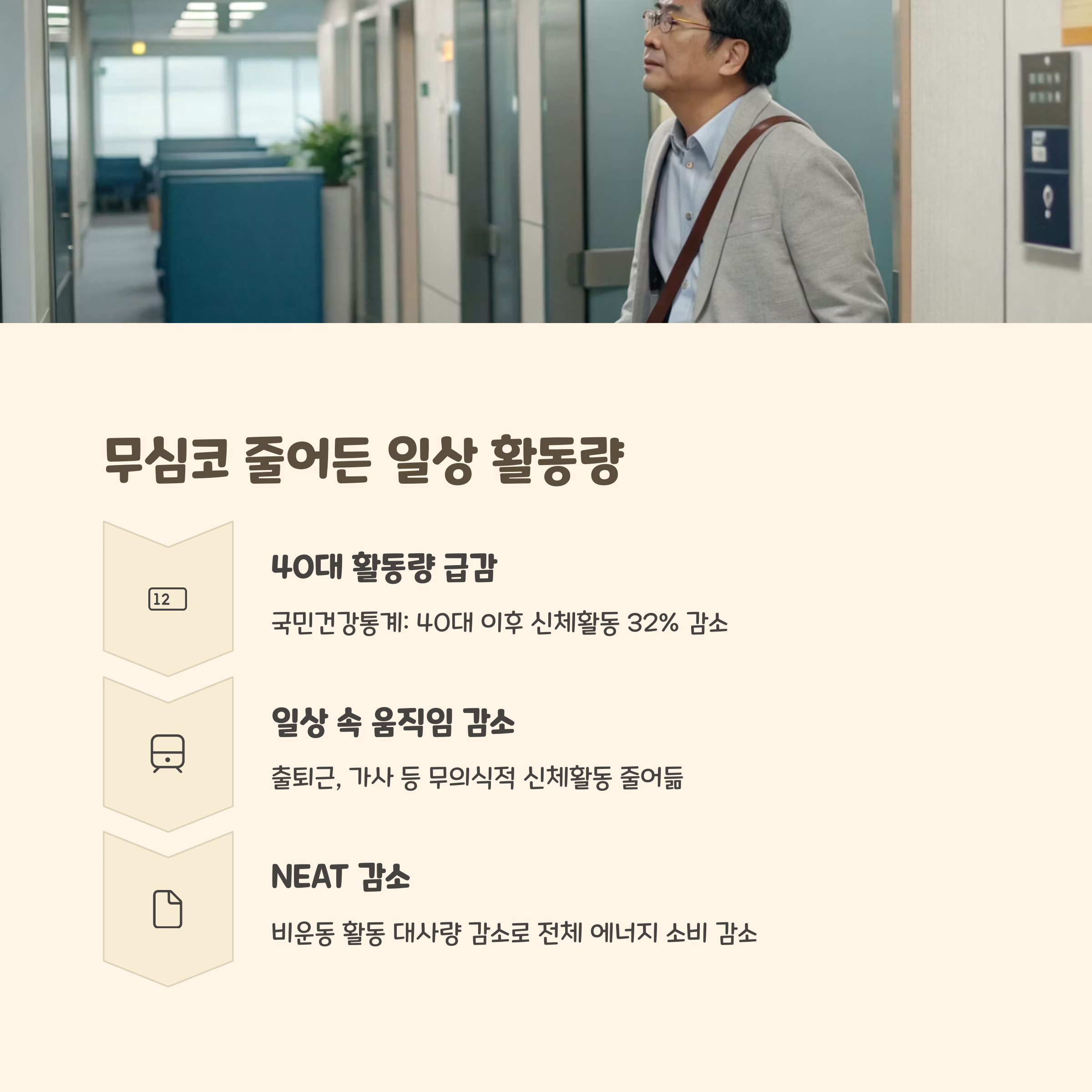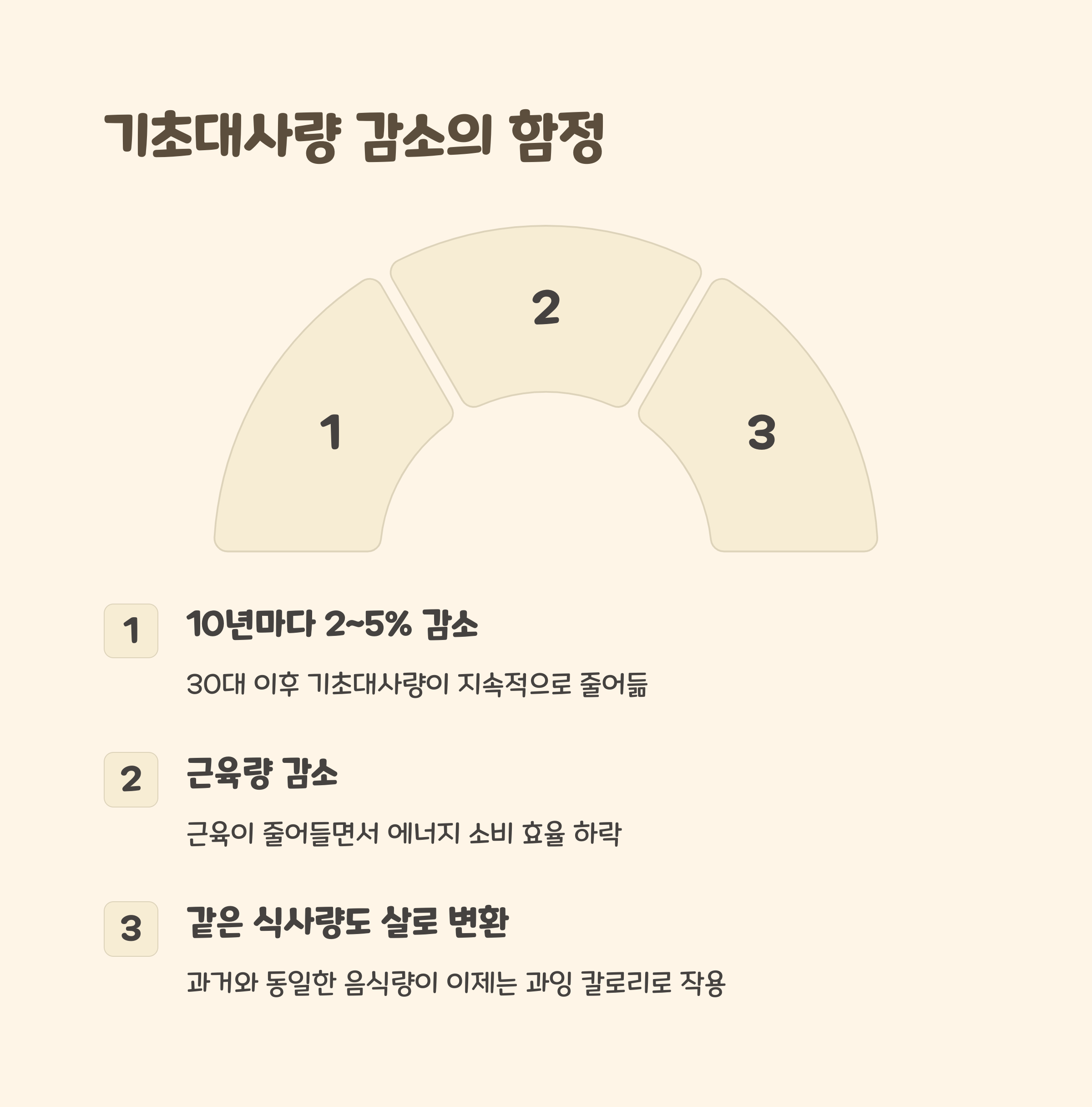 40대 이후로 기초대사량은 10년마다 3~5% 정도 꾸준히 감소합니다.