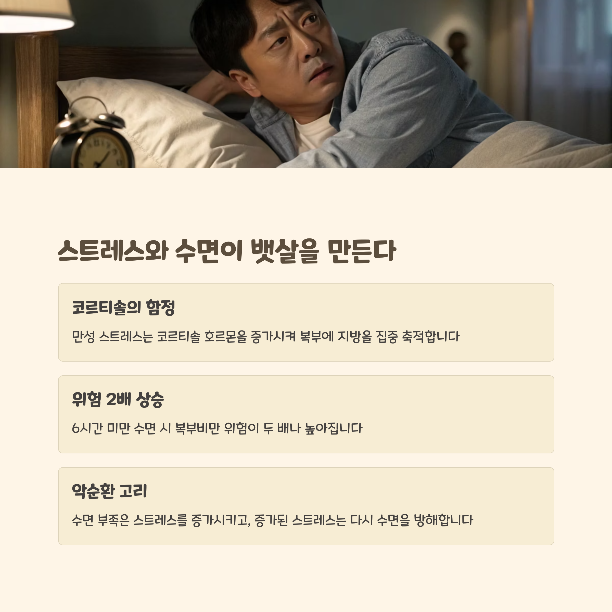 "하루 6시간 이하 수면은 복부 비만 위험을 2배 이상 높인다"는 연구 결과도 있습니다.