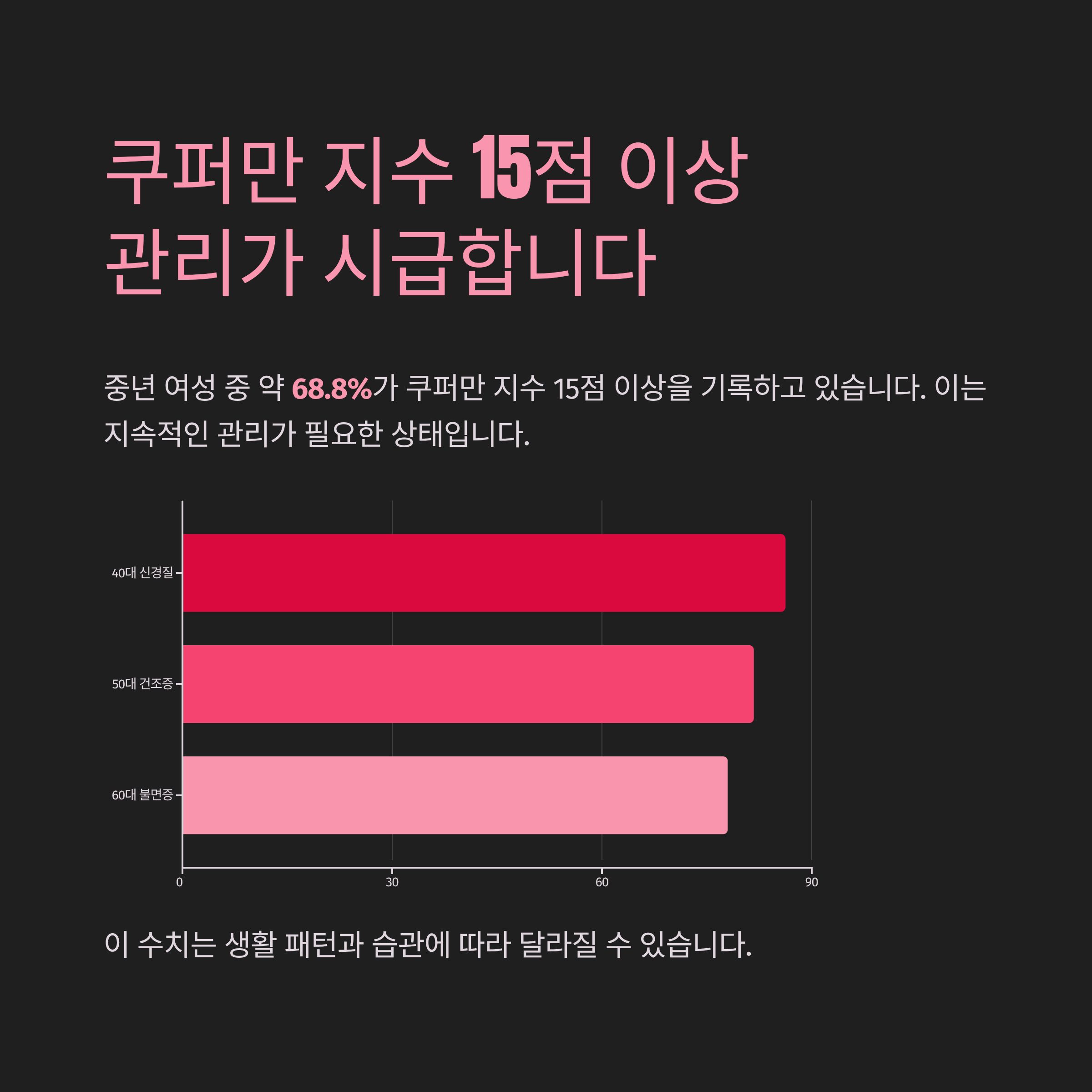 최근 국내 데이터에 따르면, 중년 여성 중 약 68.8%가 쿠퍼만 지수 15점 이상을 기록하고 있습니다. 이는 단순한 일시적 증상이 아닌, 지속적인 관리가 필요한 ‘진짜 갱년기’ 상태에 속해 있다는 것을 의미합니다.