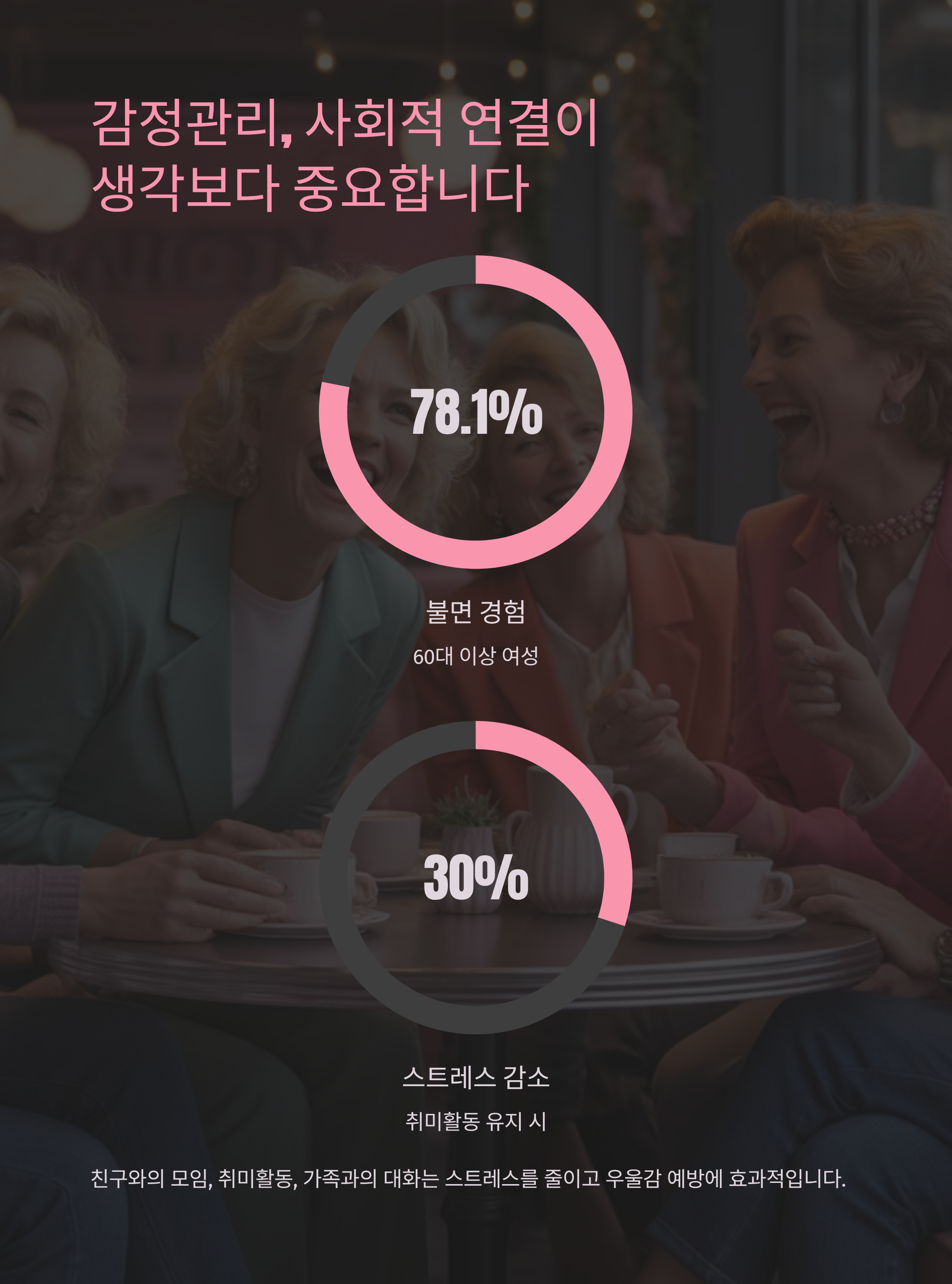 60대 이상 여성 중 불면을 겪는 비율은 78.1%에 달합니다. 여기엔 수면 패턴뿐 아니라 사회적 단절도 영향을 미칩니다.
