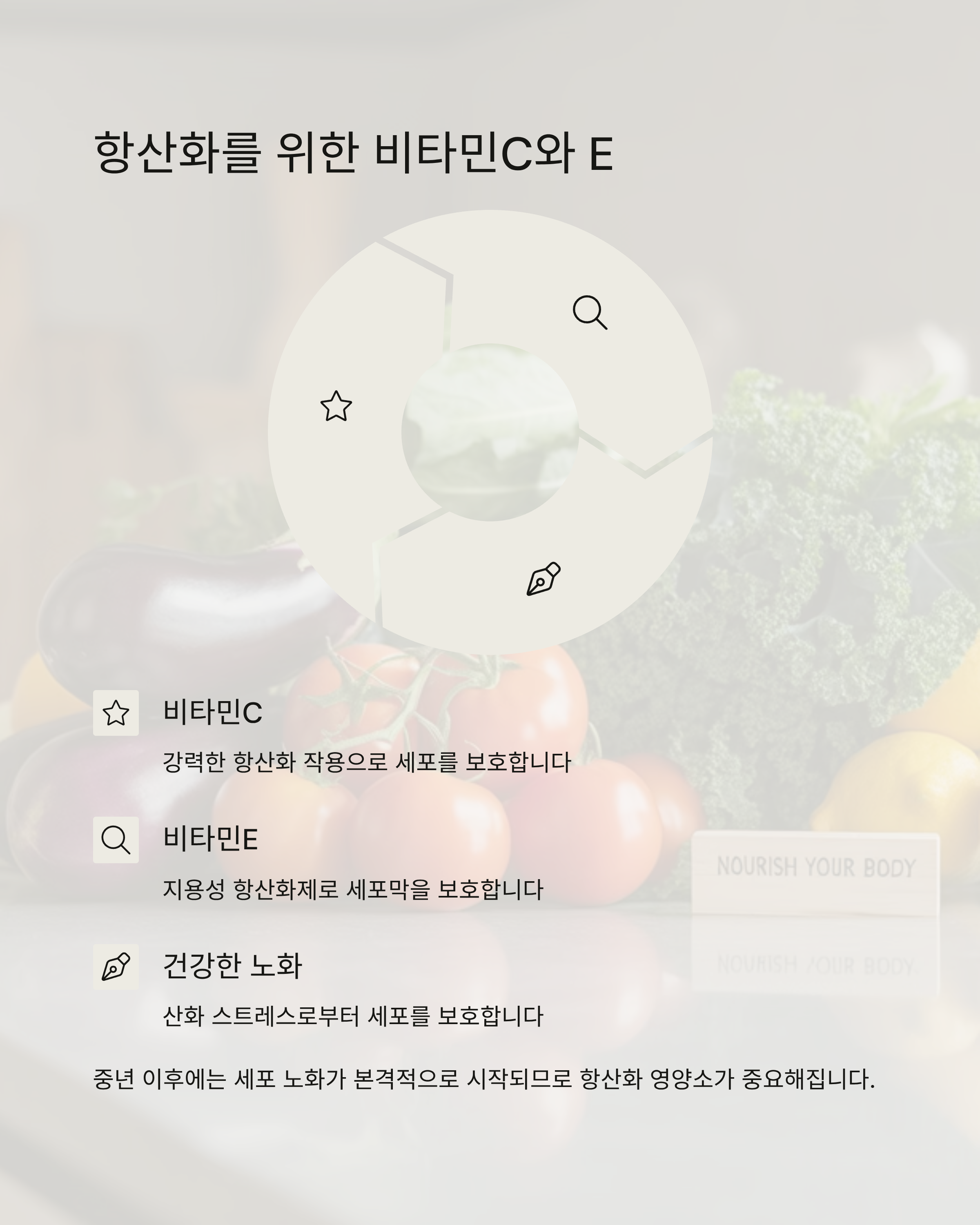 중년 이후에는 세포 노화가 본격적으로 시작되므로 항산화 영양소가 중요해집니다.