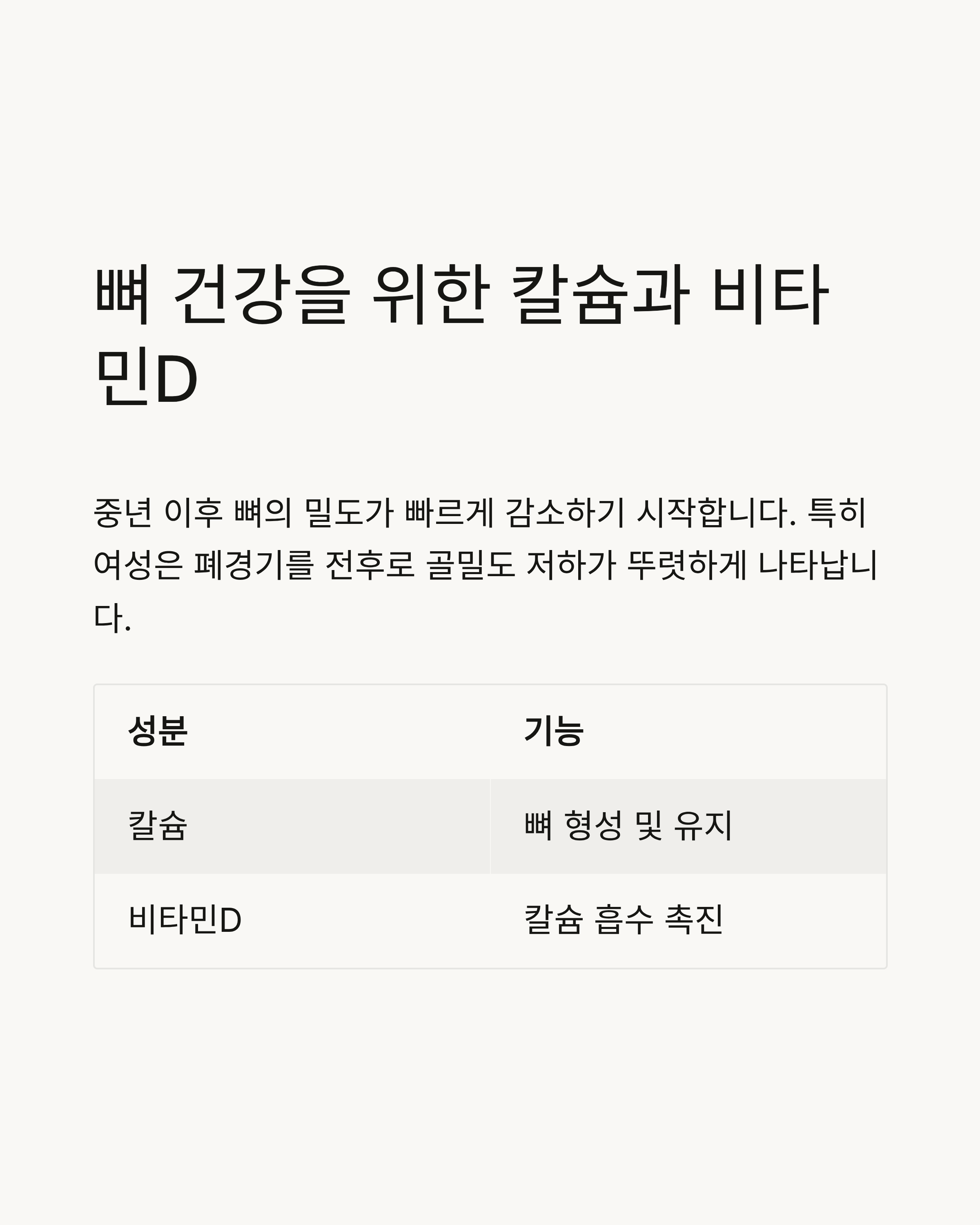 특히 여성은 폐경기를 전후로 골밀도 저하가 뚜렷하게 나타나므로 칼슘과 비타민D는 필수입니다.