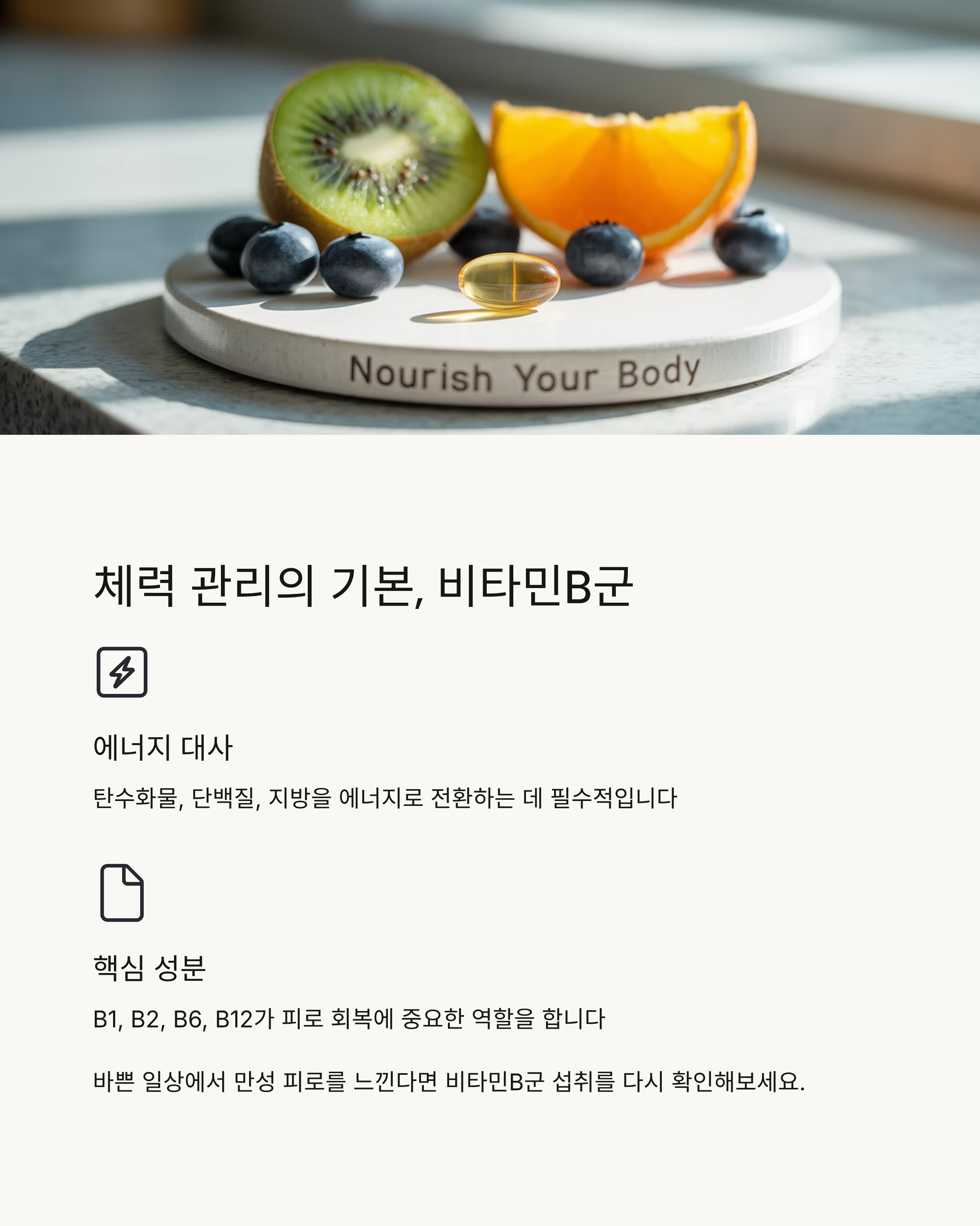 특히 B1, B2, B6, B12는 탄수화물, 단백질, 지방을 에너지로 전환하는 데 필수적이죠.