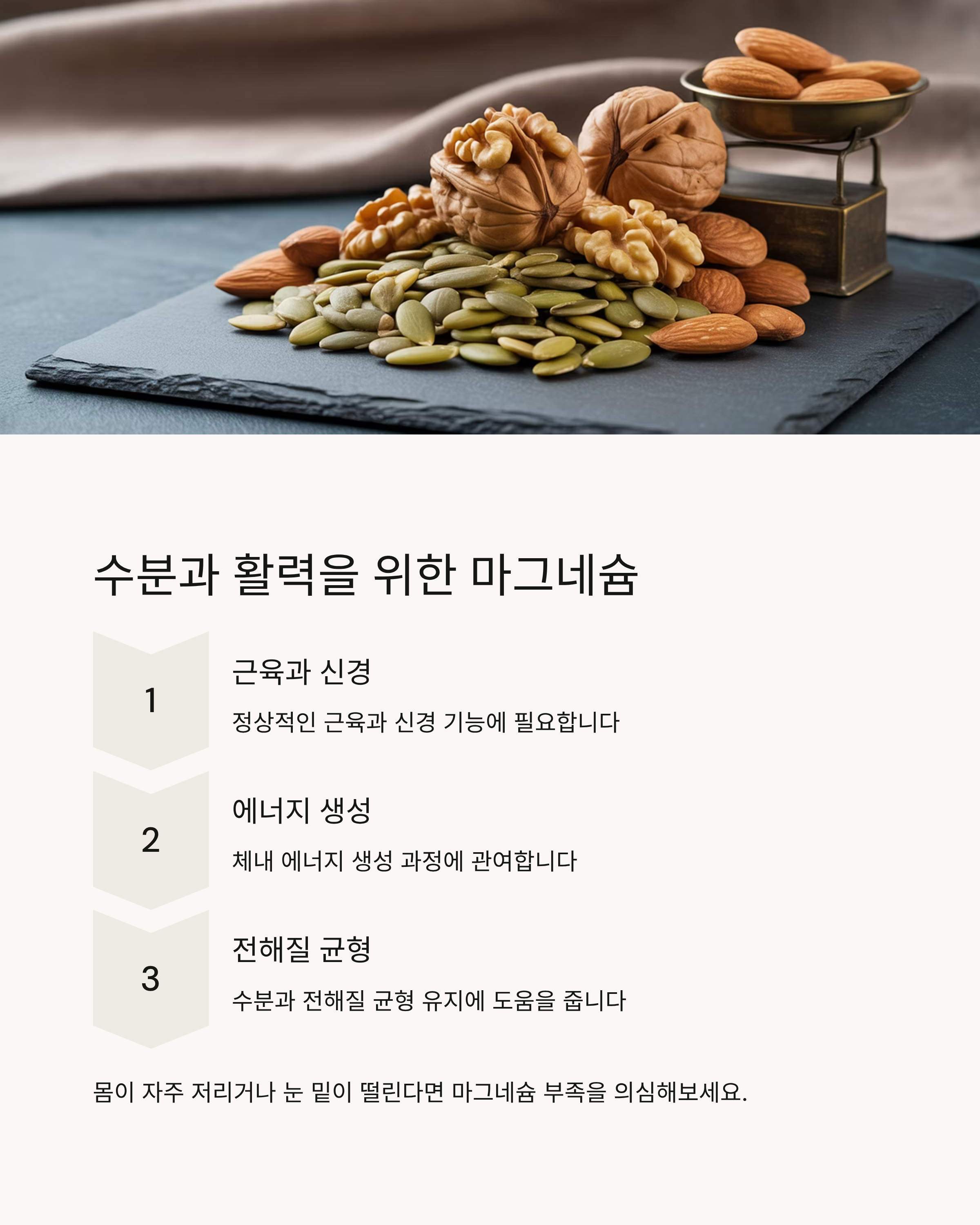 중년부터는 수분과 전해질 균형도 중요한데, 마그네슘이 바로 그 균형을 유지하는 데 도움을 줄 수 있죠.