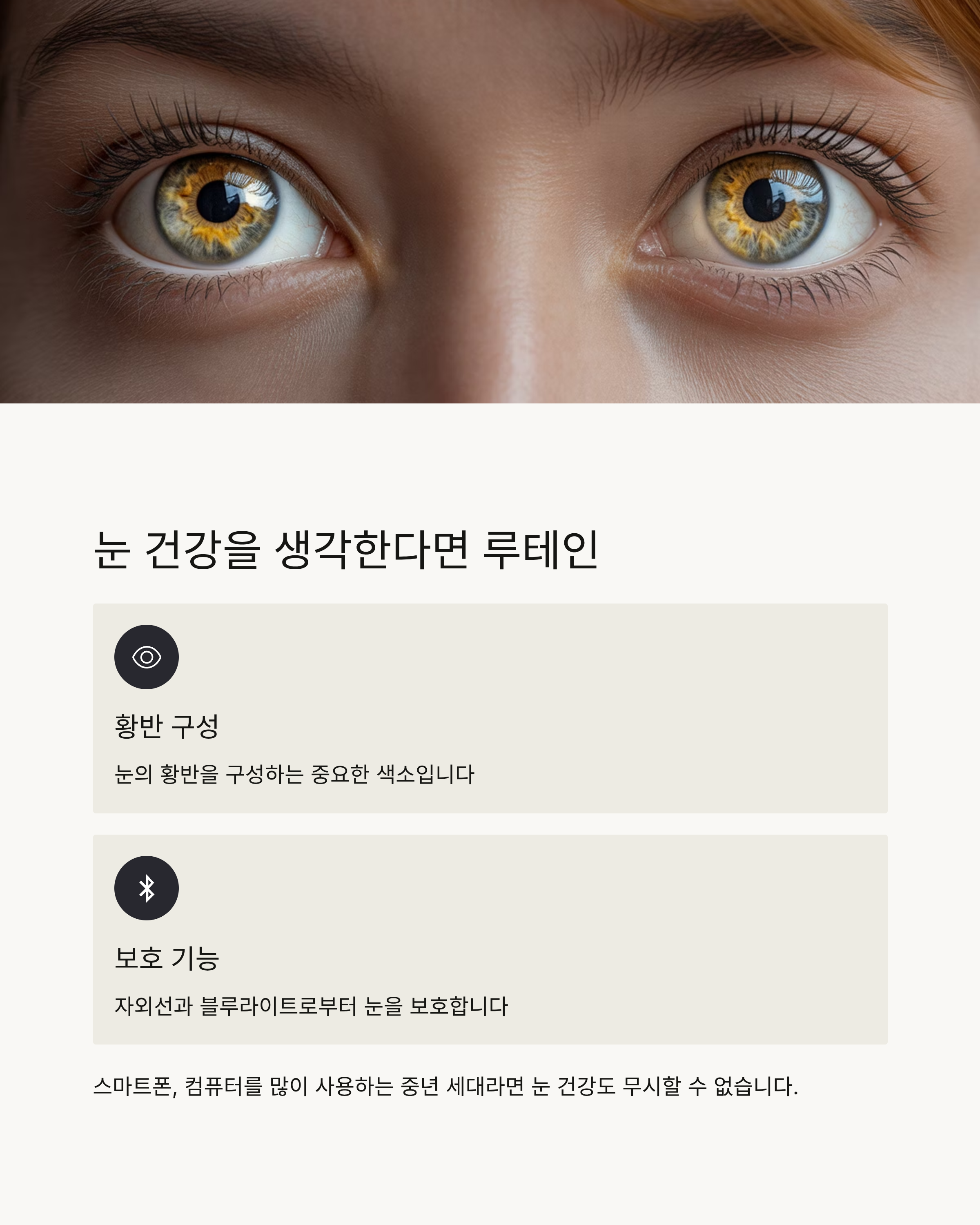 스마트폰, 컴퓨터를 많이 사용하는 중년 세대라면 눈 건강도 무시할 수 없습니다.