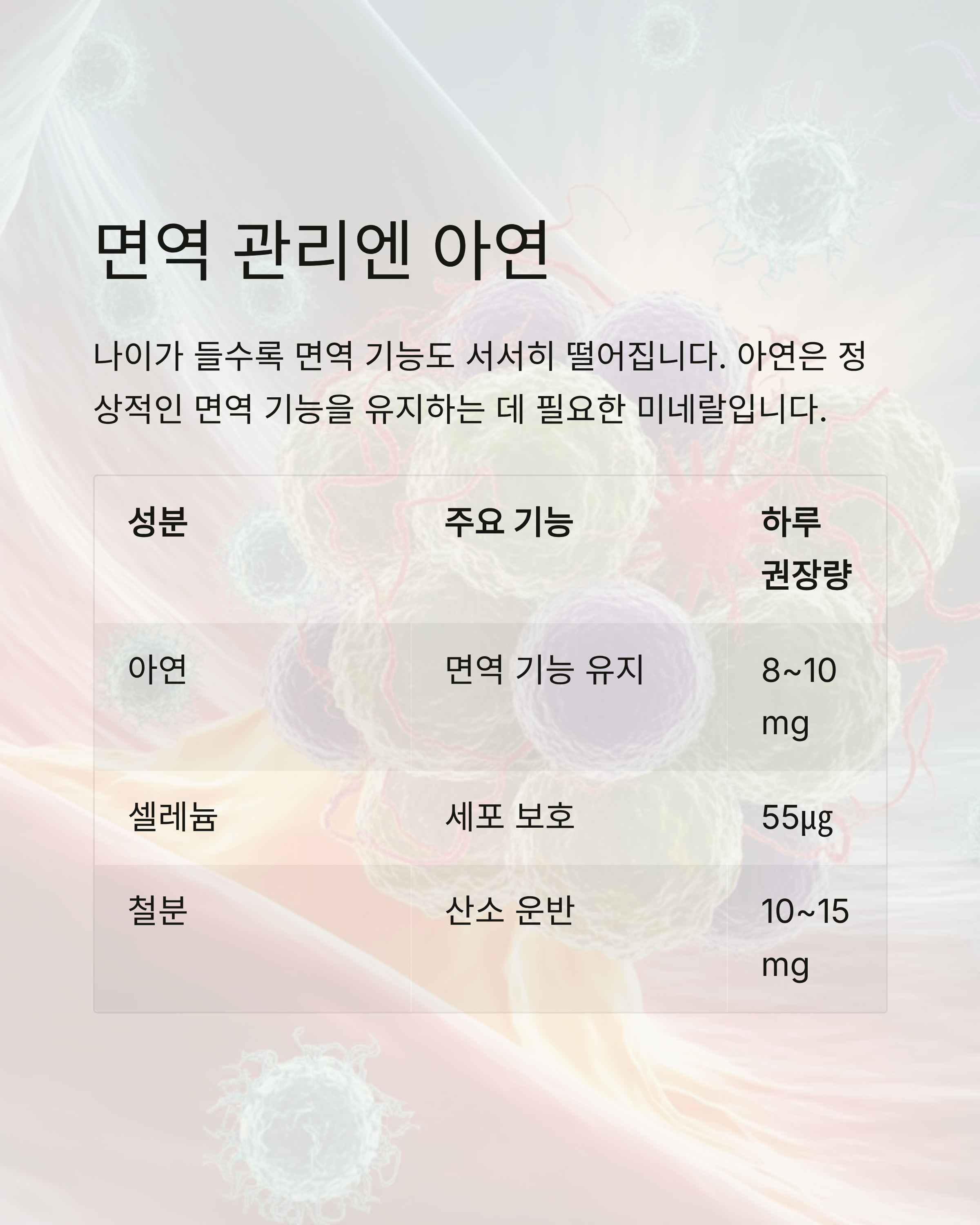 | 아연 | 면역 기능 유지 | 8~10mg |