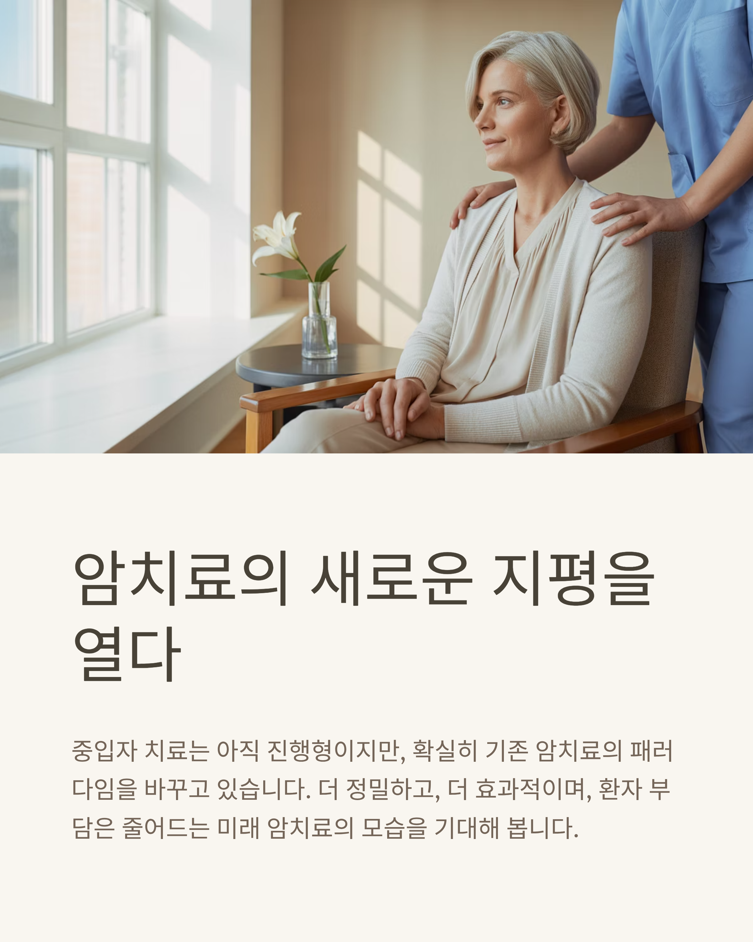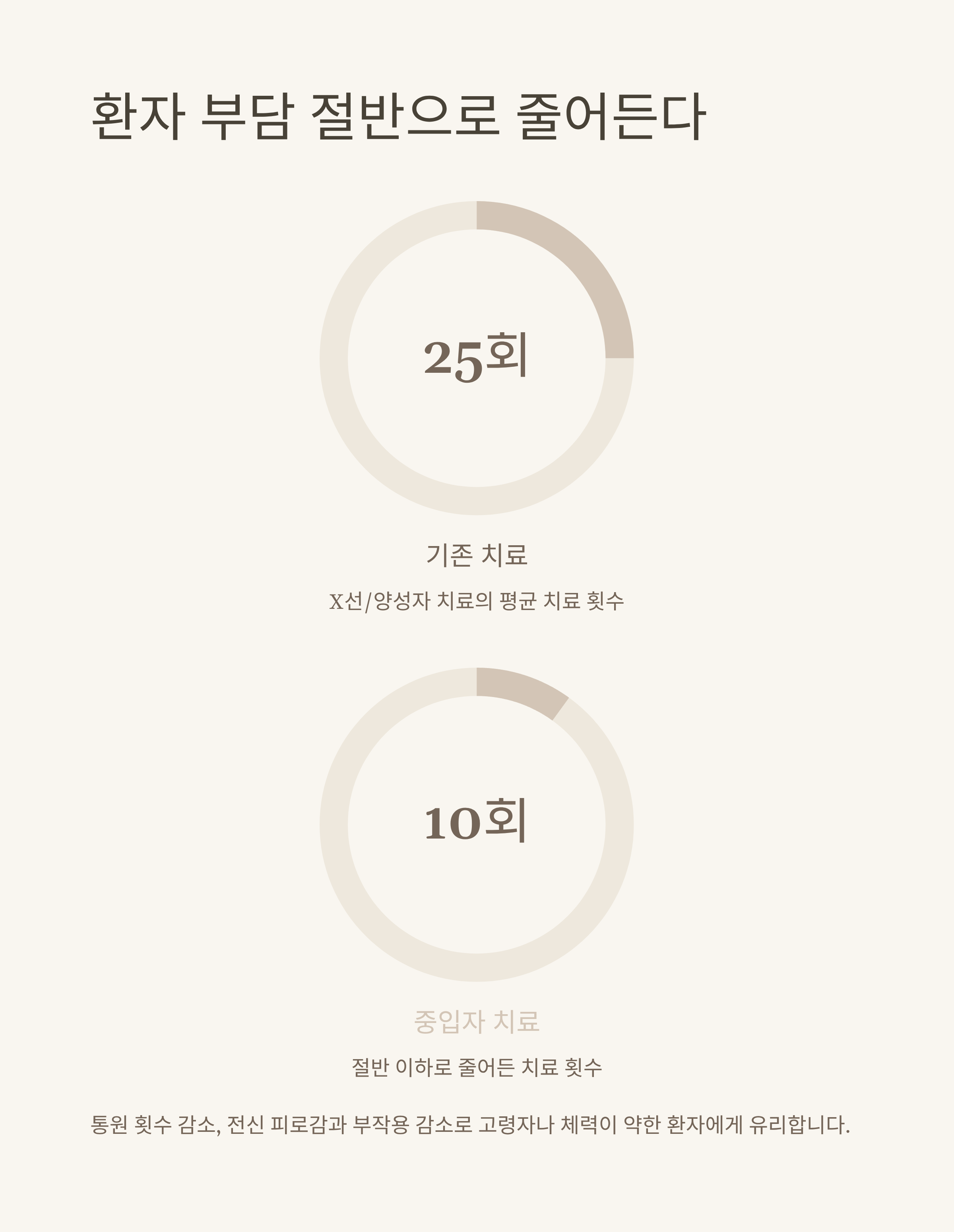 환자의 통원 치료 횟수가 줄고, 전신 피로감이나 부작용도 크게 감소하는 장점이 있어 고령자나 체력이 약한 환자에게 더 유리한 치료 방식입니다.