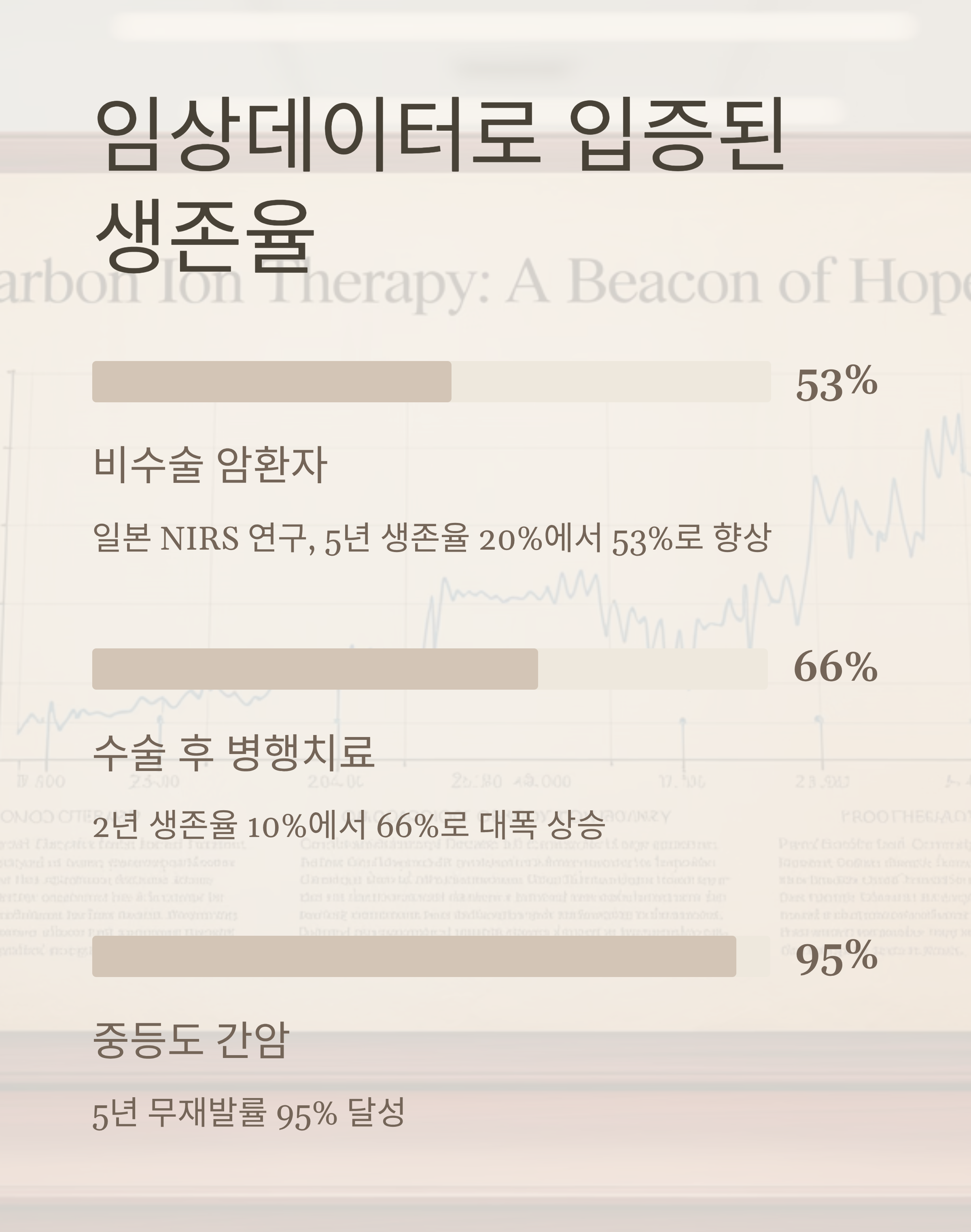 일본 NIRS 연구에 따르면 수술이 불가능한 암환자에게 중입자 치료만 적용했을 때, 5년 생존율이 20% 이하에서 53%까지 향상된 사례가 있습니다.