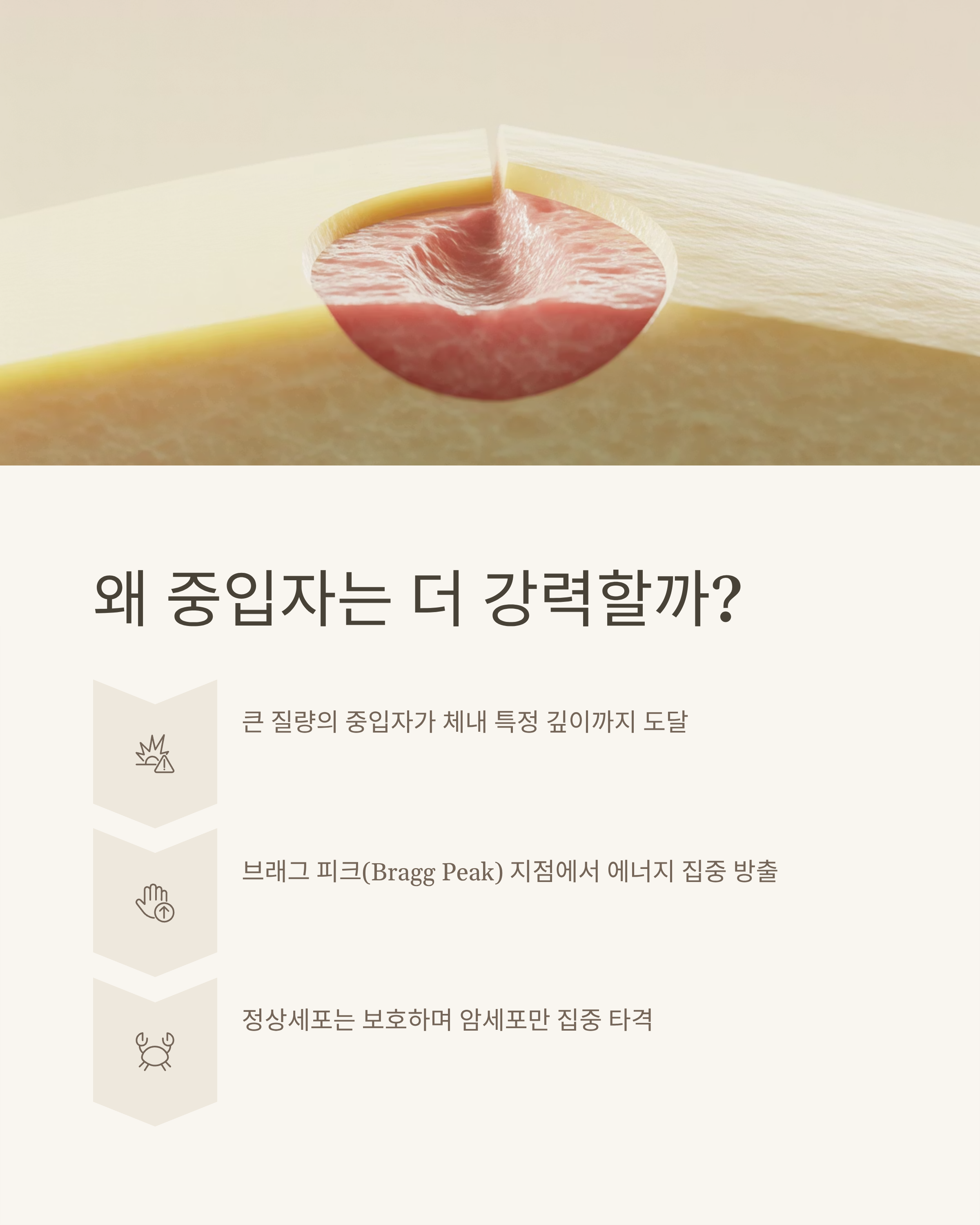 중입자는 질량이 크기 때문에 생체 내에서 특정 깊이까지 도달한 후 급격히 에너지를 방출하는 브래그 피크(Bragg Peak) 특성을 가집니다.