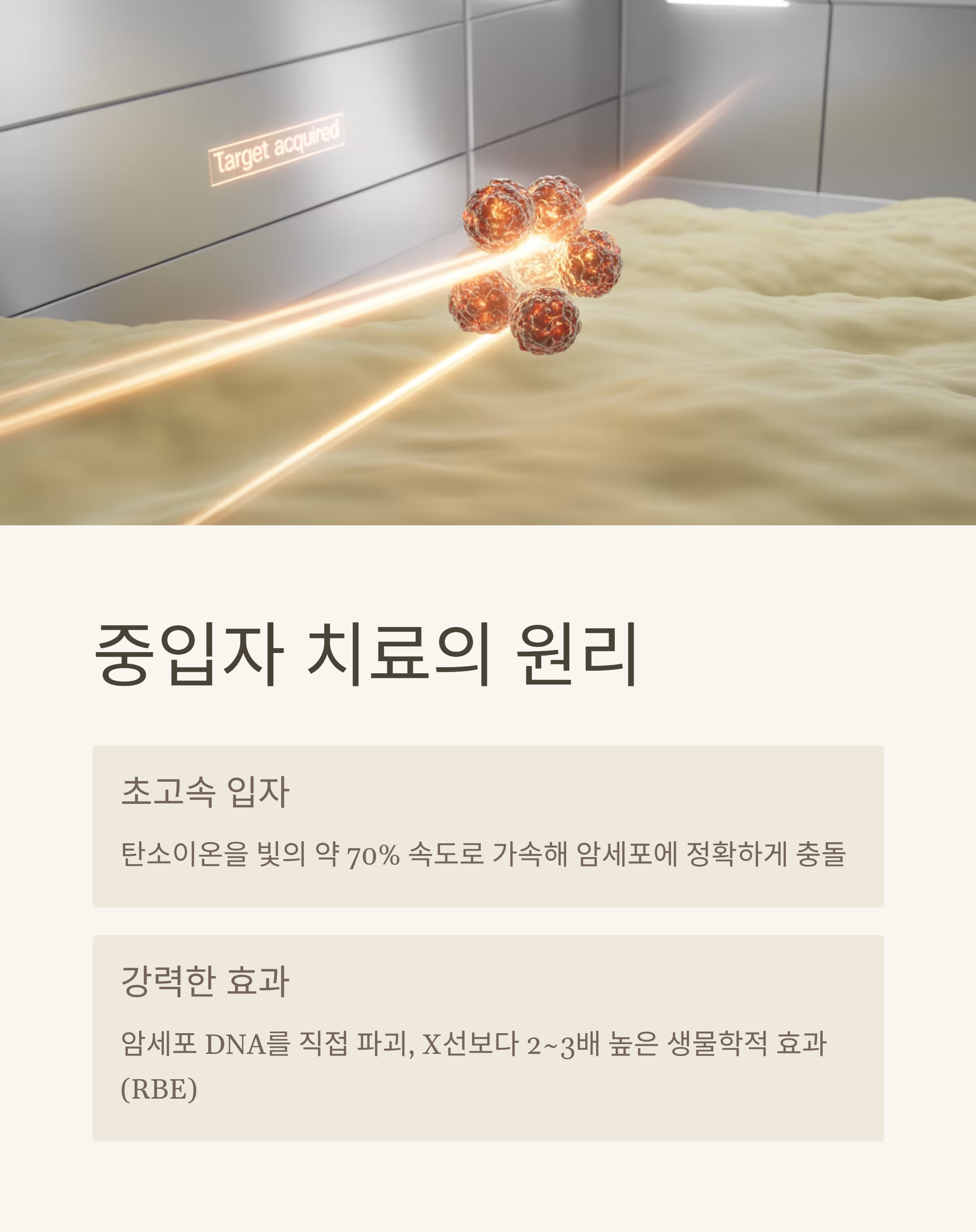 중입자 치료는 탄소이온(Carbon ion) 같은 무거운 입자를 빛의 약 70% 속도로 가속해 암세포에 정확하게 충돌시키는 치료 방식입니다.