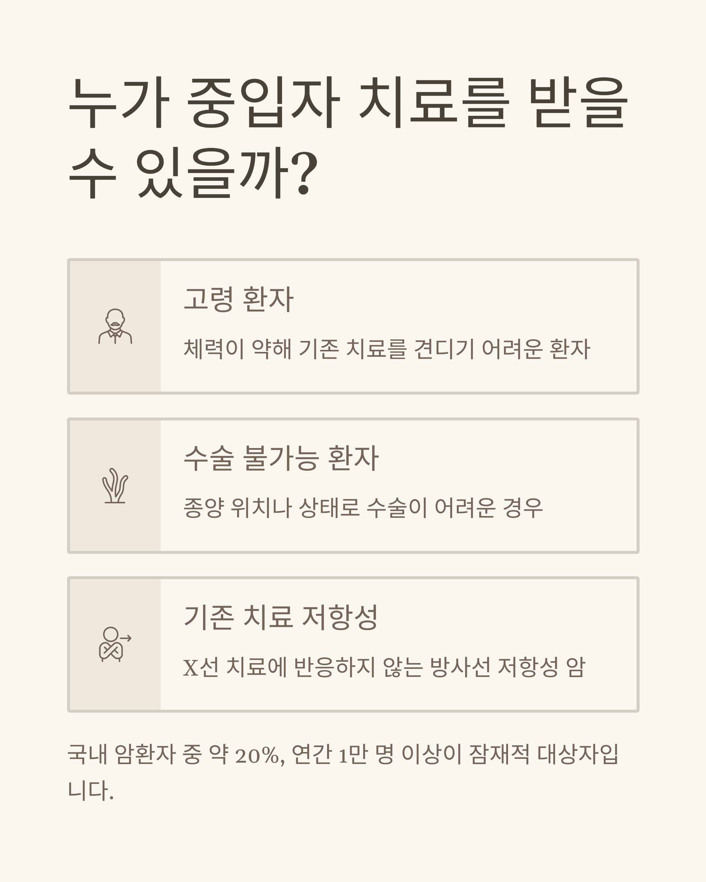 국내 암환자 중 약 20%, 연 1만 명 이상이 중입자 치료의 잠재 대상자로 평가됩니다.