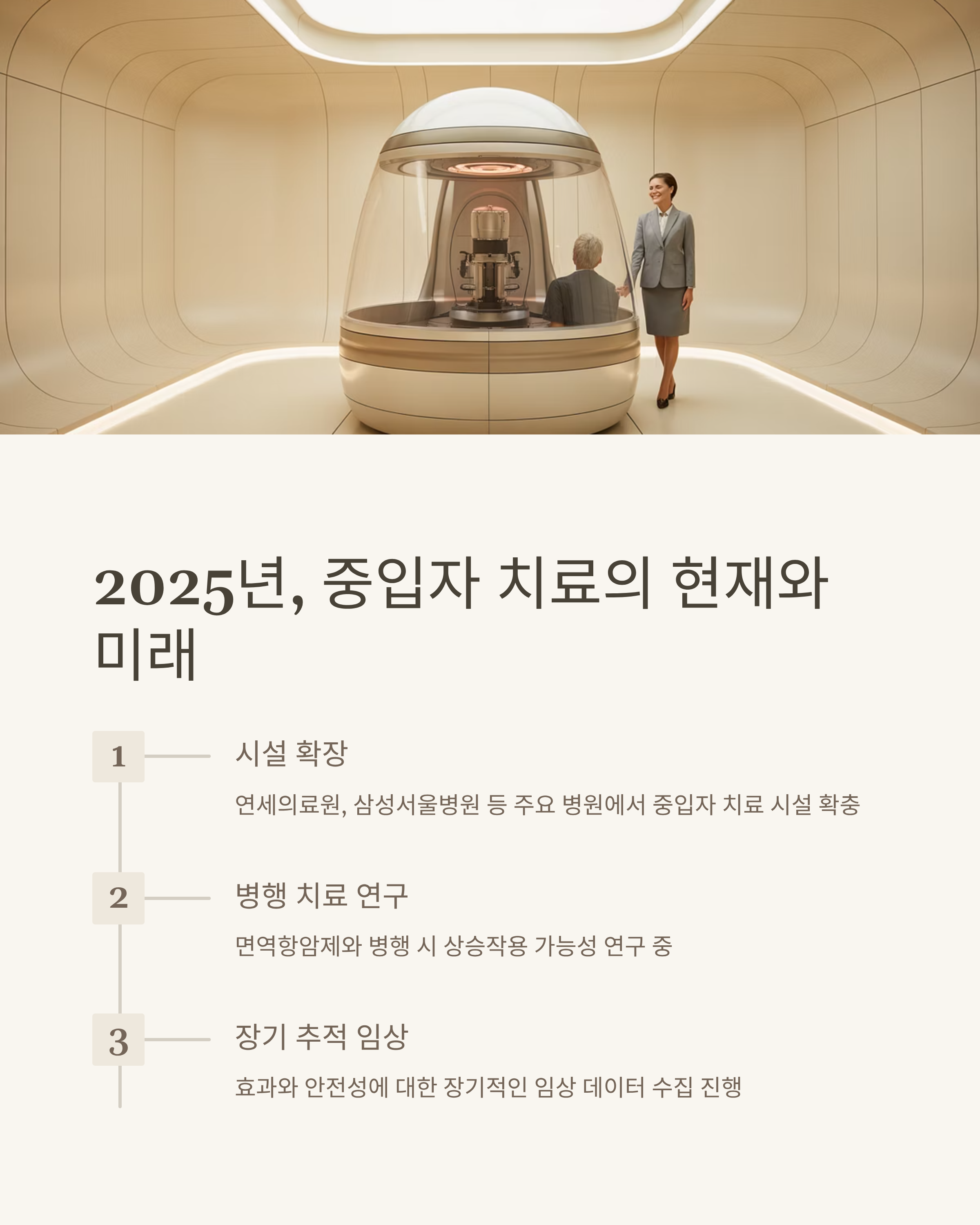 2025년 현재 연세의료원, 삼성서울병원 등 주요 병원에서 중입자 치료 시설 확장을 본격화하고 있습니다.