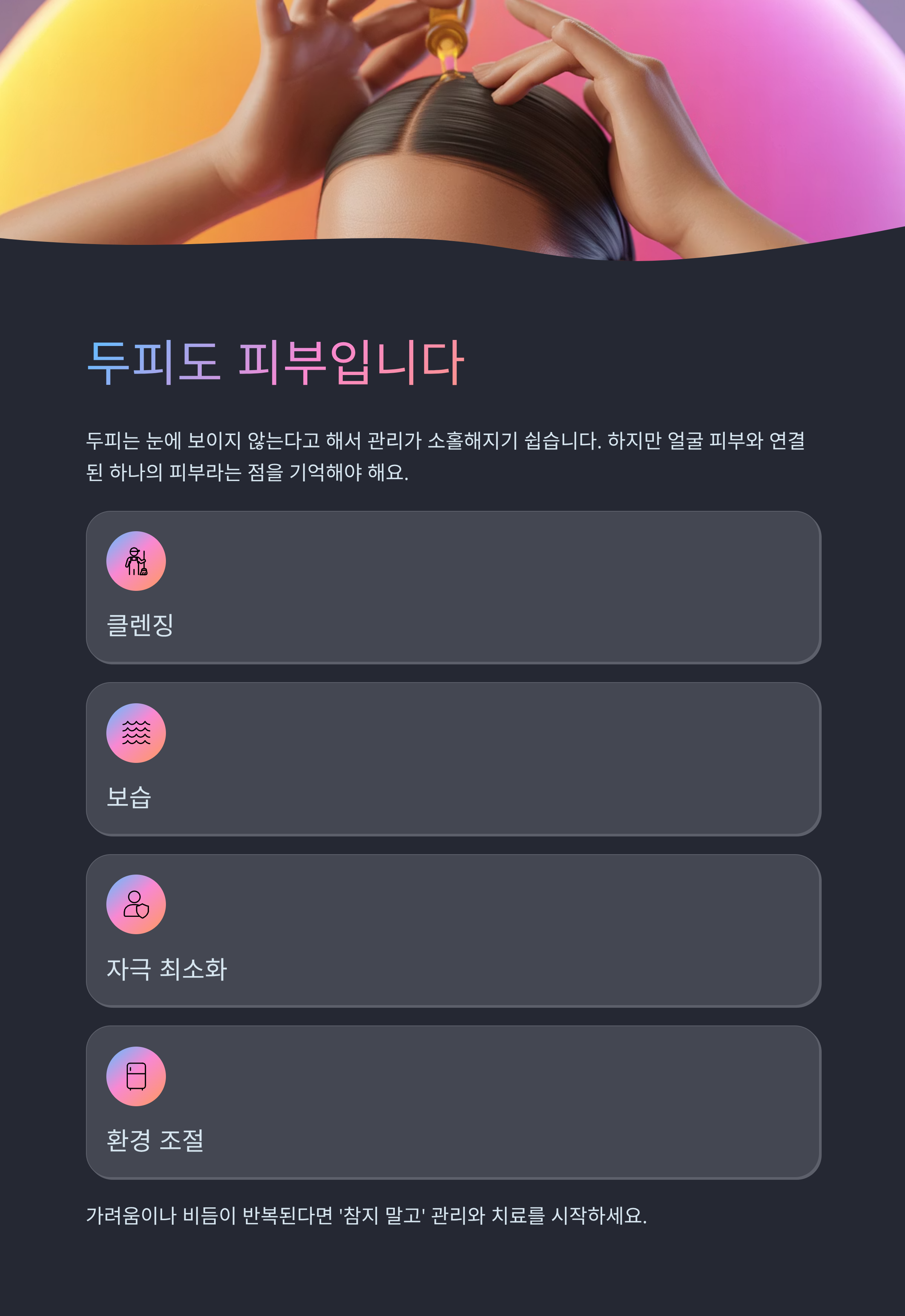 피부처럼 클렌징, 보습, 자극 최소화, 환경 조절 등이 꼭 필요합니다. 가려움이나 비듬이 반복된다면 ‘참지 말고’ 관리와 치료를 시작하세요.