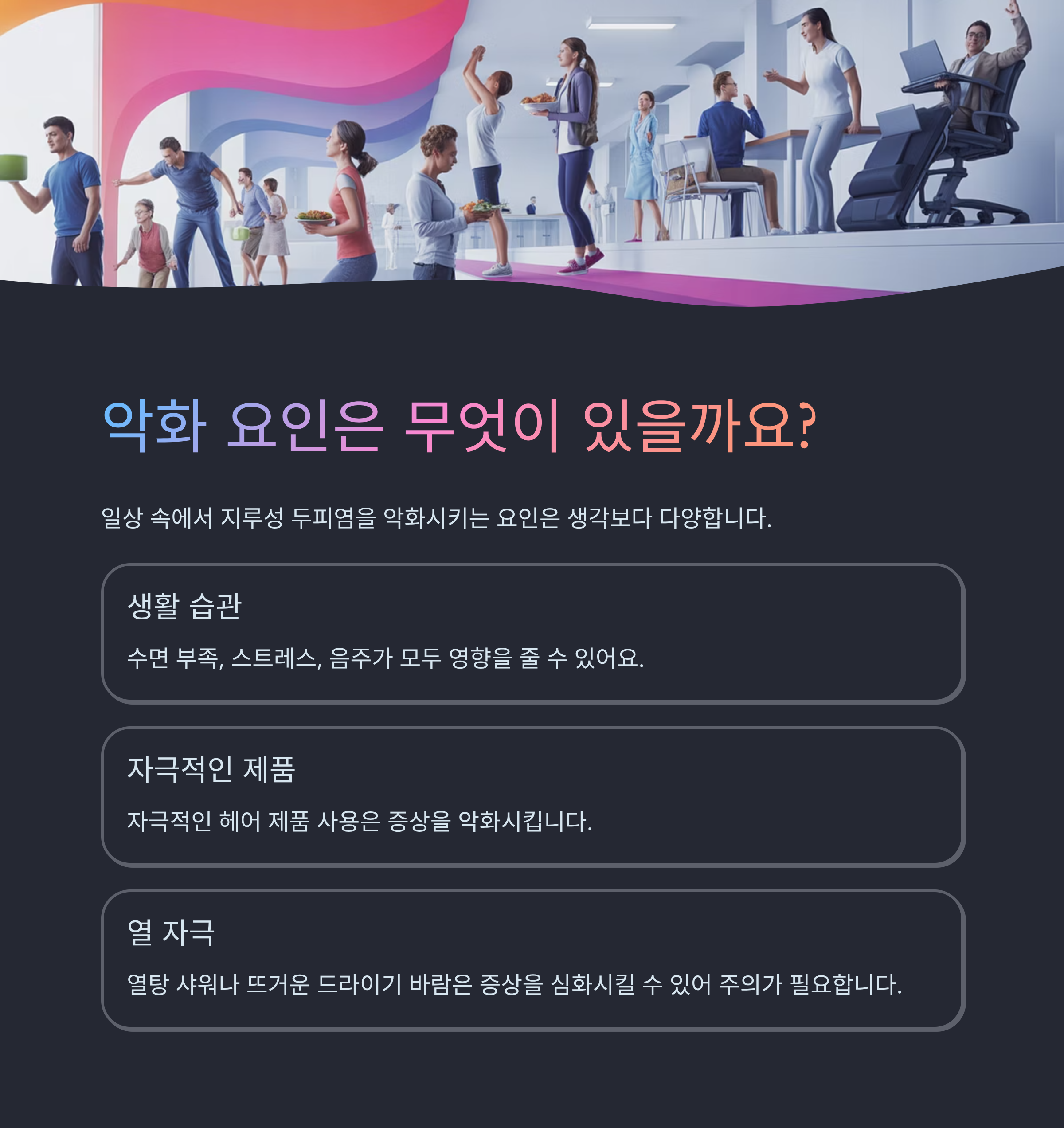 수면 부족, 스트레스, 음주, 자극적인 헤어 제품 사용 등이 모두 영향을 줄 수 있어요. 특히 열탕 샤워나 뜨거운 드라이기 바람은 증상을 심화시킬 수 있어 주의가 필요합니다.