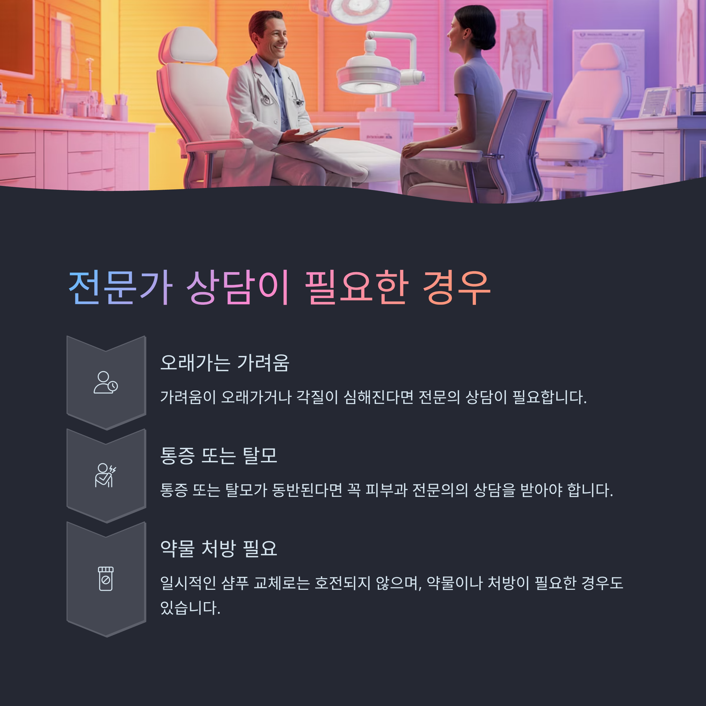 일시적인 샴푸 교체로는 호전되지 않으며, 약물이나 처방이 필요한 경우도 있기 때문입니다.