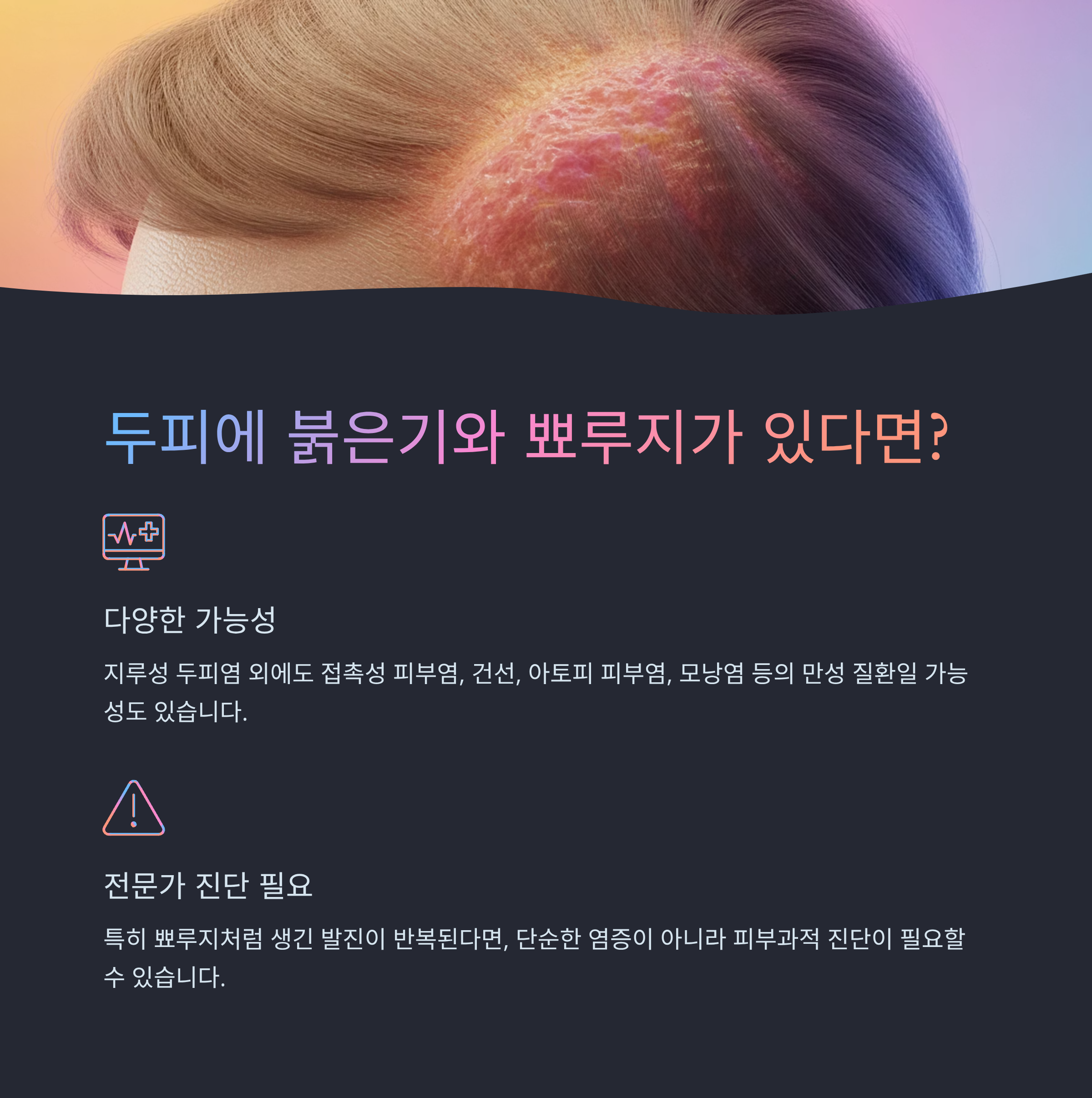 지루성 두피염 외에도 접촉성 피부염, 건선, 아토피 피부염, 모낭염 등의 만성 질환일 가능성도 있습니다.