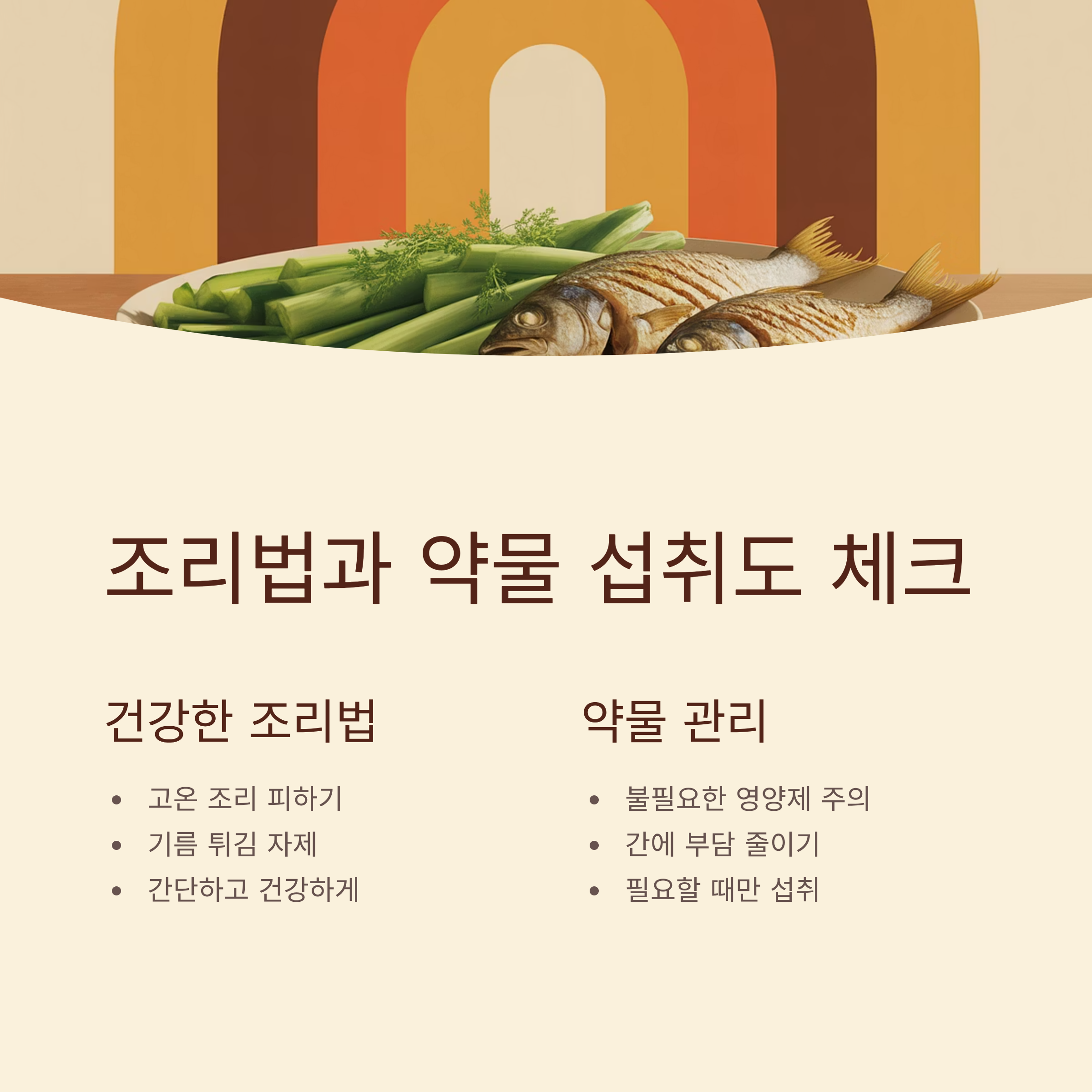 간에 무리를 줄 수 있는 고온 조리, 기름 튀김 등은 피해야 합니다.