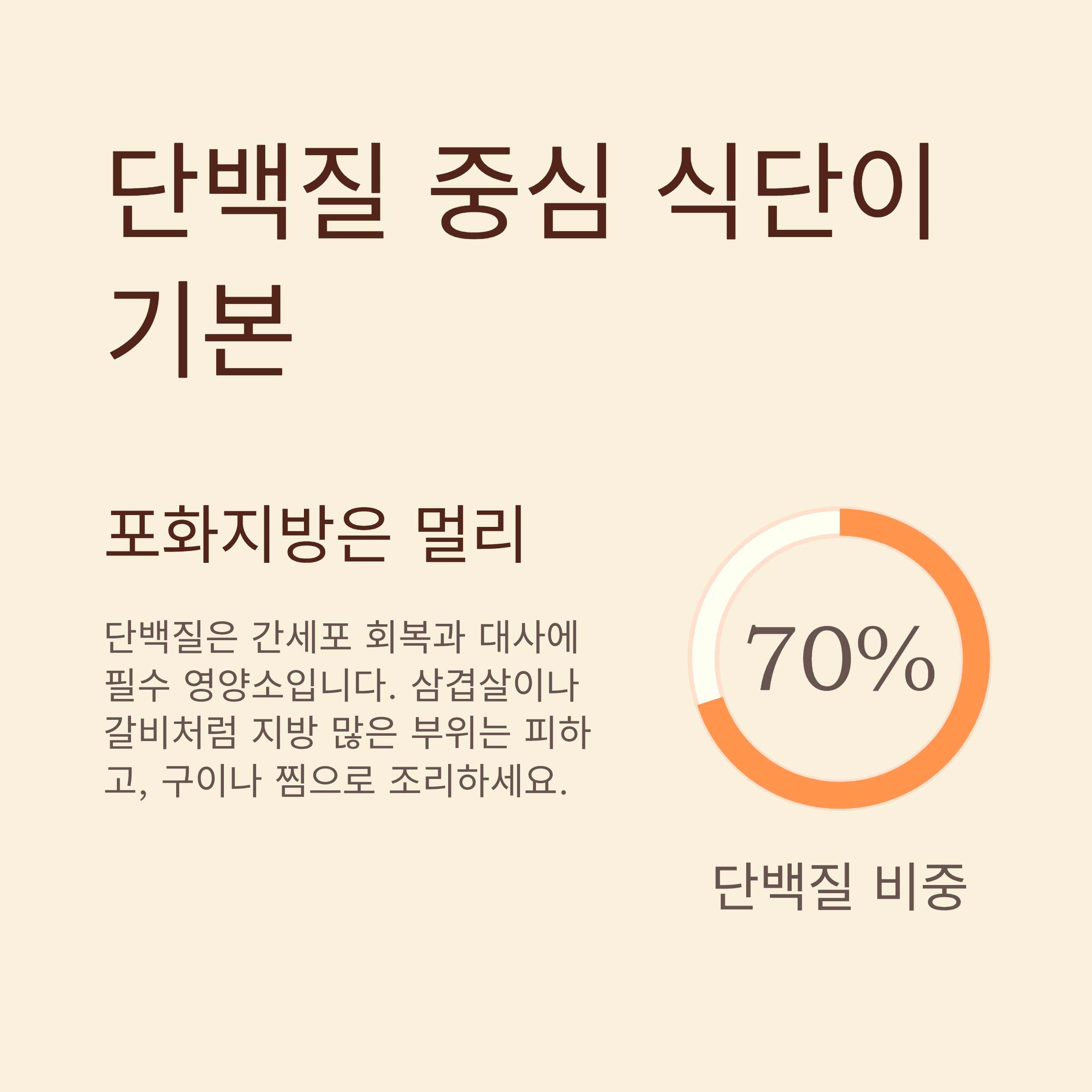 지방간을 예방하려면 식사의 중심을 단백질에 두어야 해요. 단백질은 간세포 회복과 대사에 꼭 필요한 영양소니까요.