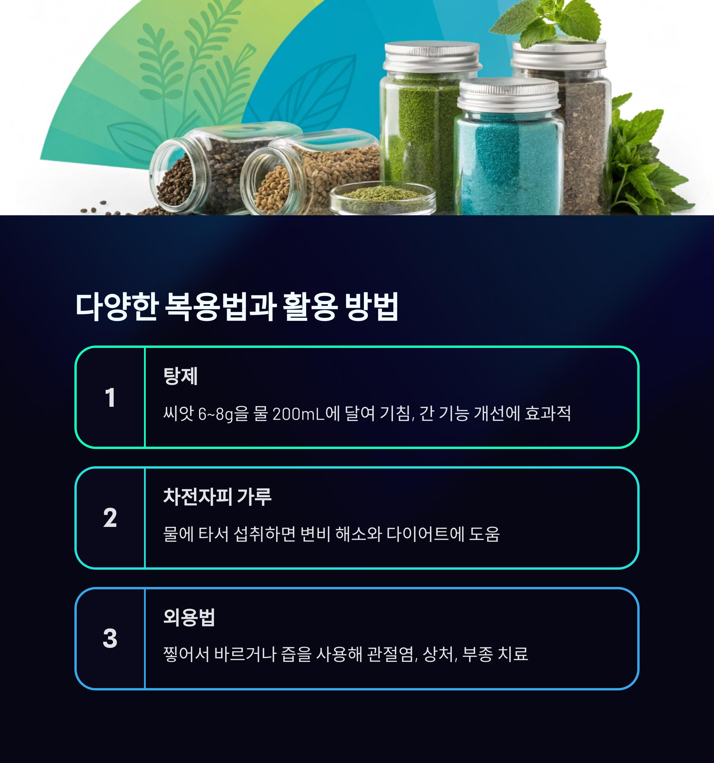 | 차전자피 가루 | 물에 타서 섭취 | 변비, 다이어트 |
