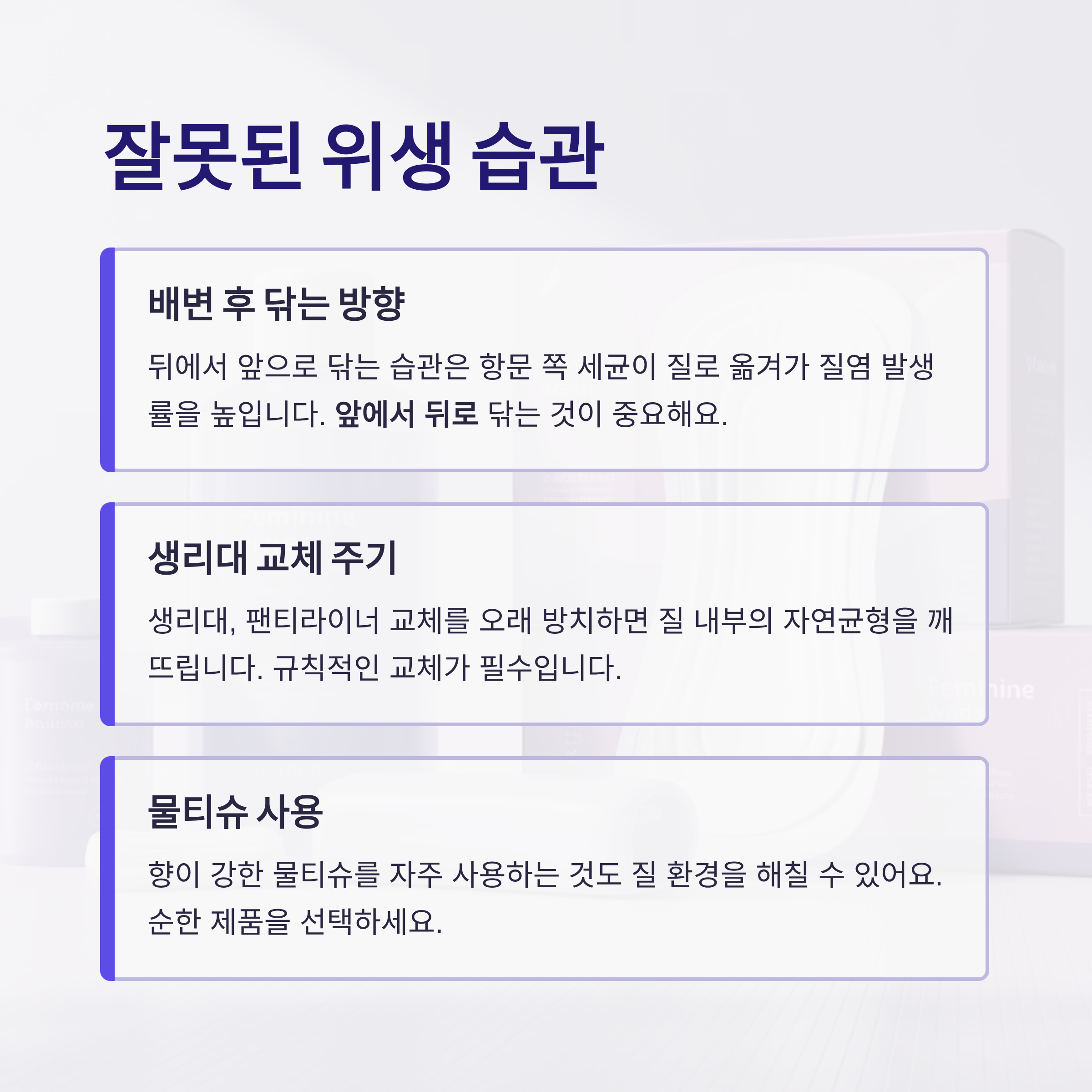 또한 생리대, 팬티라이너 교체를 오래 방치하거나 향이 강한 물티슈를 자주 사용하는 것도 질 내부의 자연균형을 깨뜨릴 수 있습니다. 위생적이지만 순한 제품 사용과 규칙적인 교체가 중요합니다.