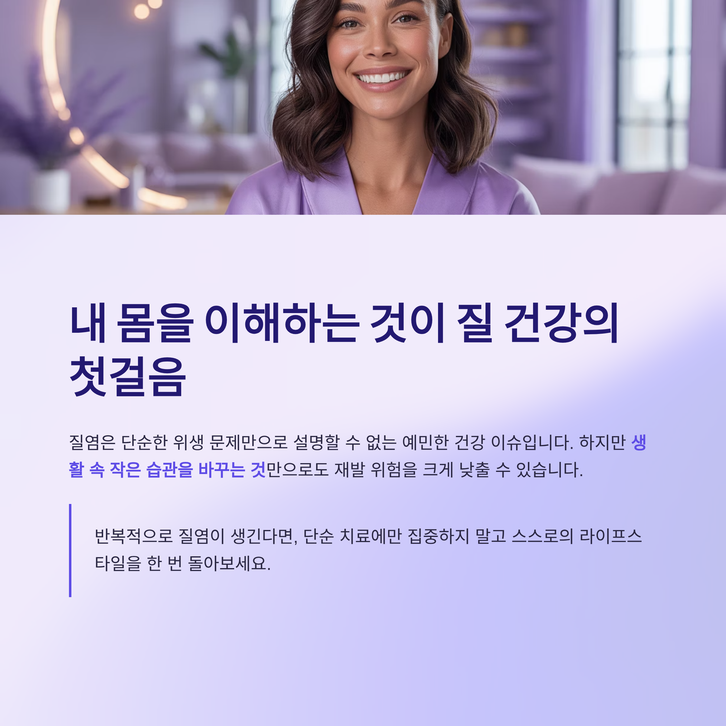 반복적으로 질염이 생긴다면, 단순 치료에만 집중하지 말고 스스로의 라이프스타일을 한 번 돌아보세요. 내 몸을 더 잘 이해하고 돌보는 습관이 질 건강의 첫걸음입니다.