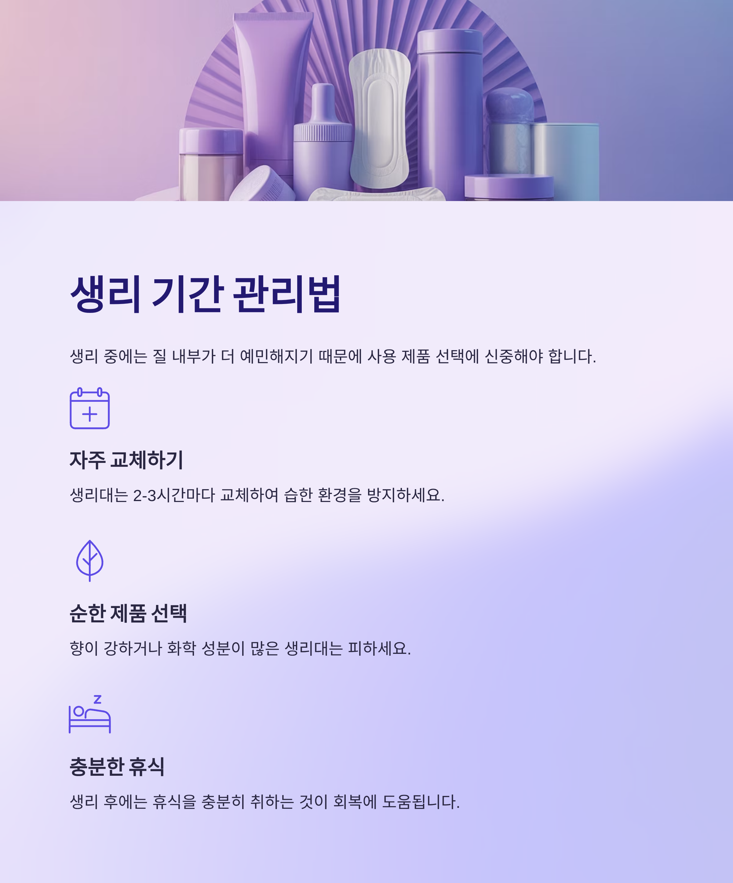 향이 강하거나 화학 성분이 많은 생리대는 피하고, 자주 교체하며, 생리 후에는 휴식을 충분히 취하는 것이 회복에 도움이 됩니다.