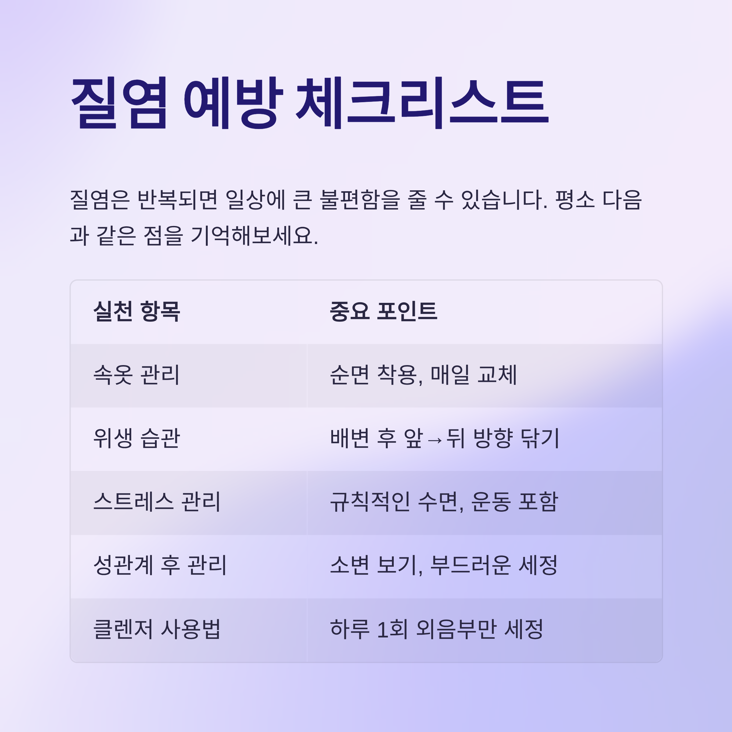 질염은 단순한 위생 문제만으로 설명할 수 없는 예민한 건강 이슈입니다. 하지만 생활 속 작은 습관을 바꾸는 것만으로도 재발 위험을 크게 낮출 수 있습니다.