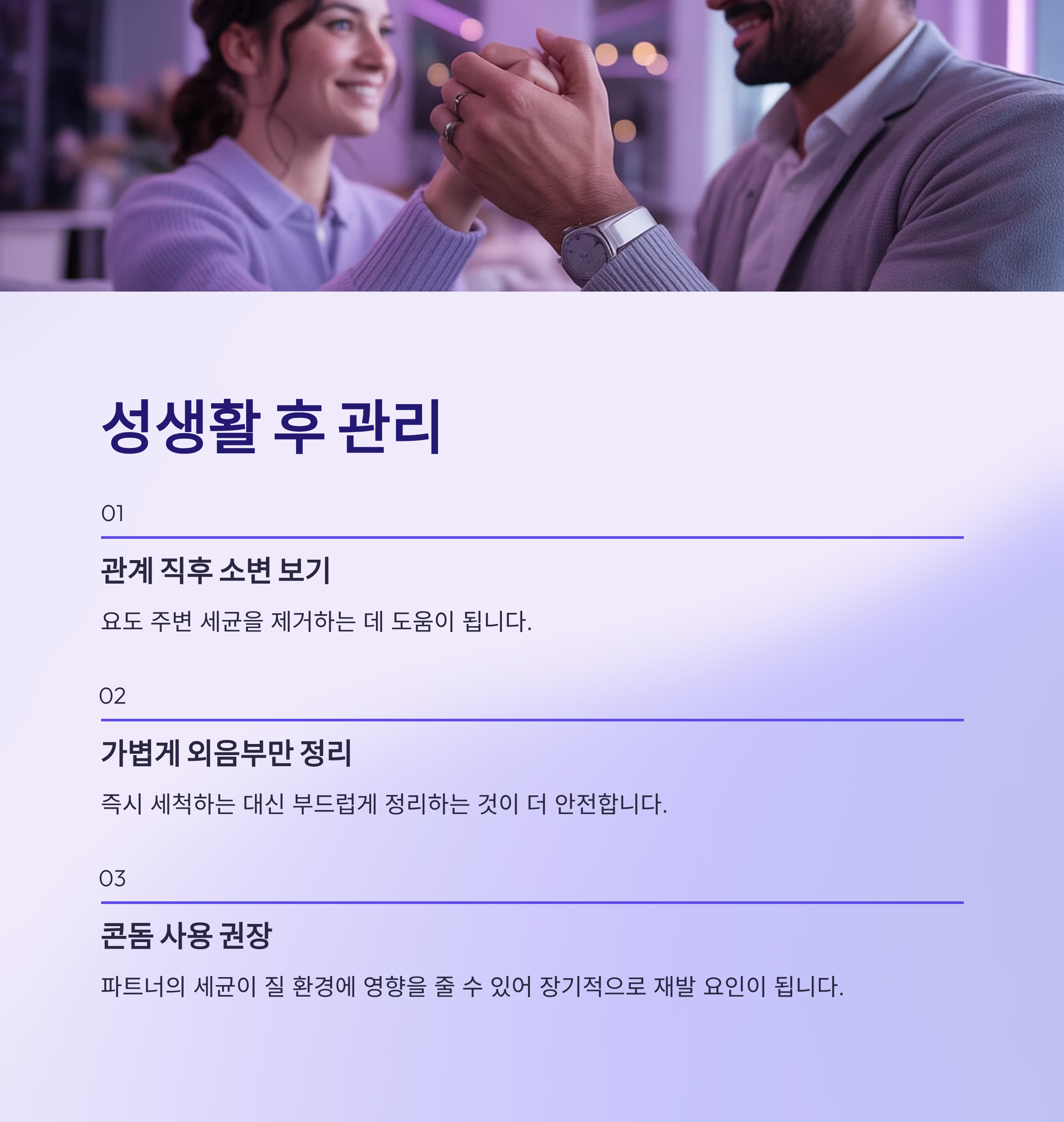 | 성관계 후 관리 | 소변 보기, 부드러운 세정 |