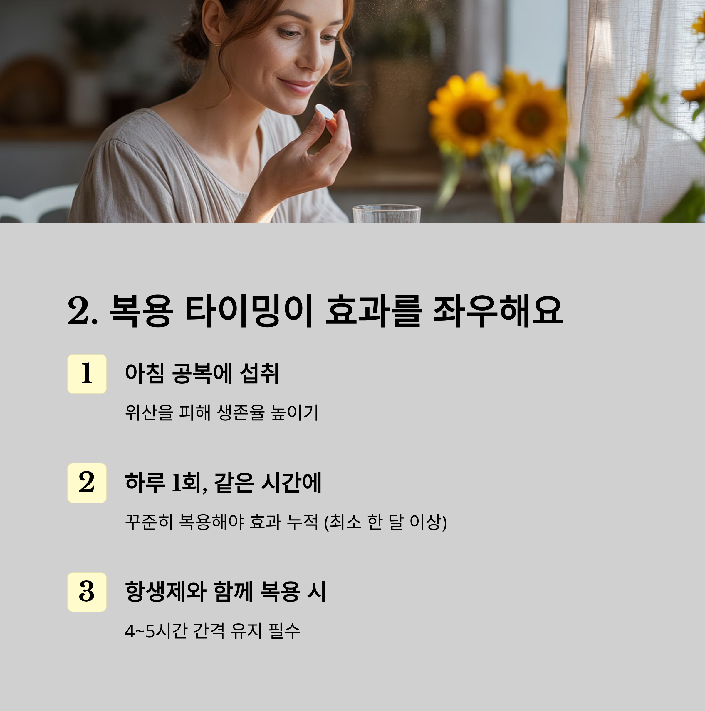 | 항생제 복용 시 | 4~5시간 간격 필요, 유익균 회복 목적 |