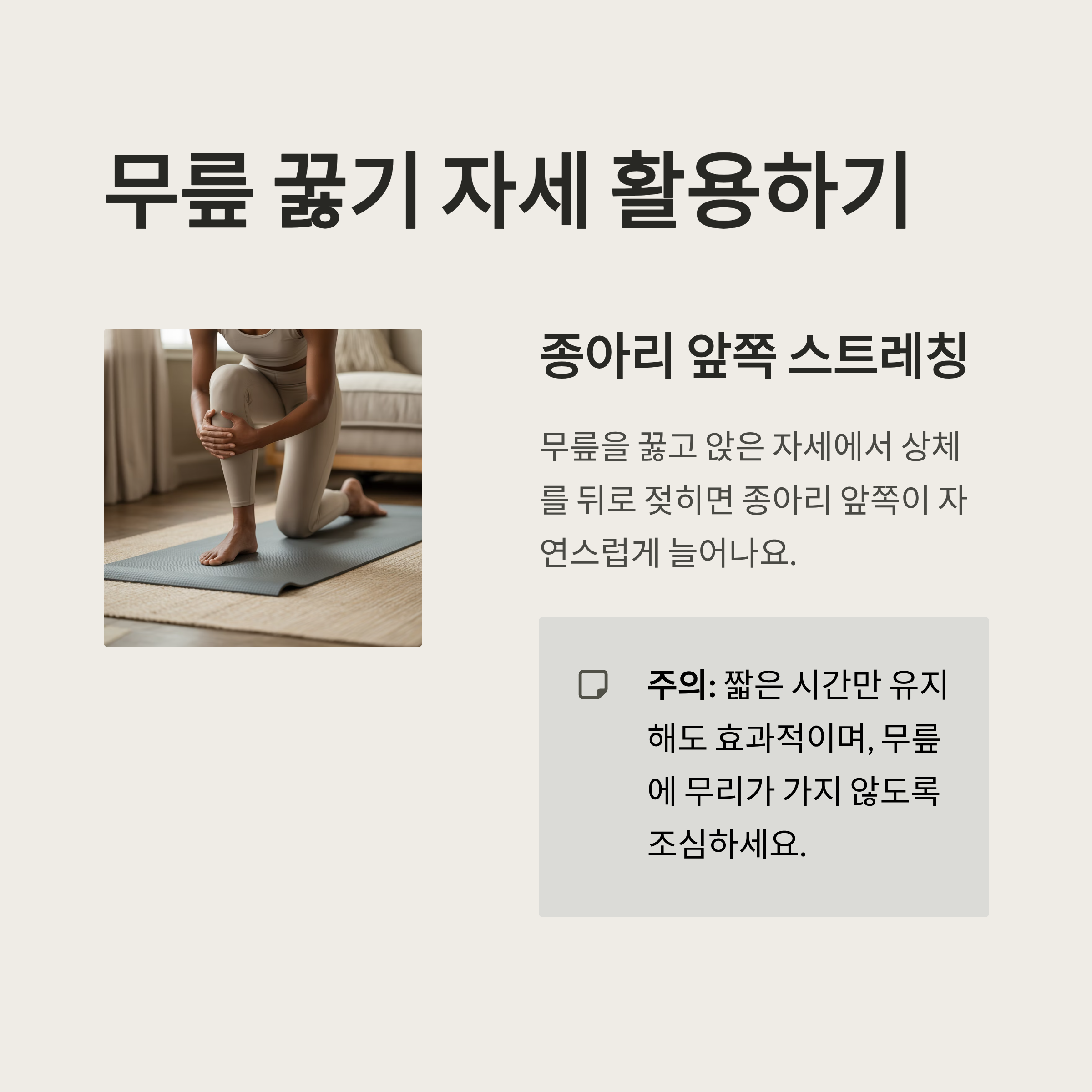 무릎을 꿇고 앉은 자세에서 상체를 뒤로 젖히면 종아리 앞쪽이 자연스럽게 늘어나요.