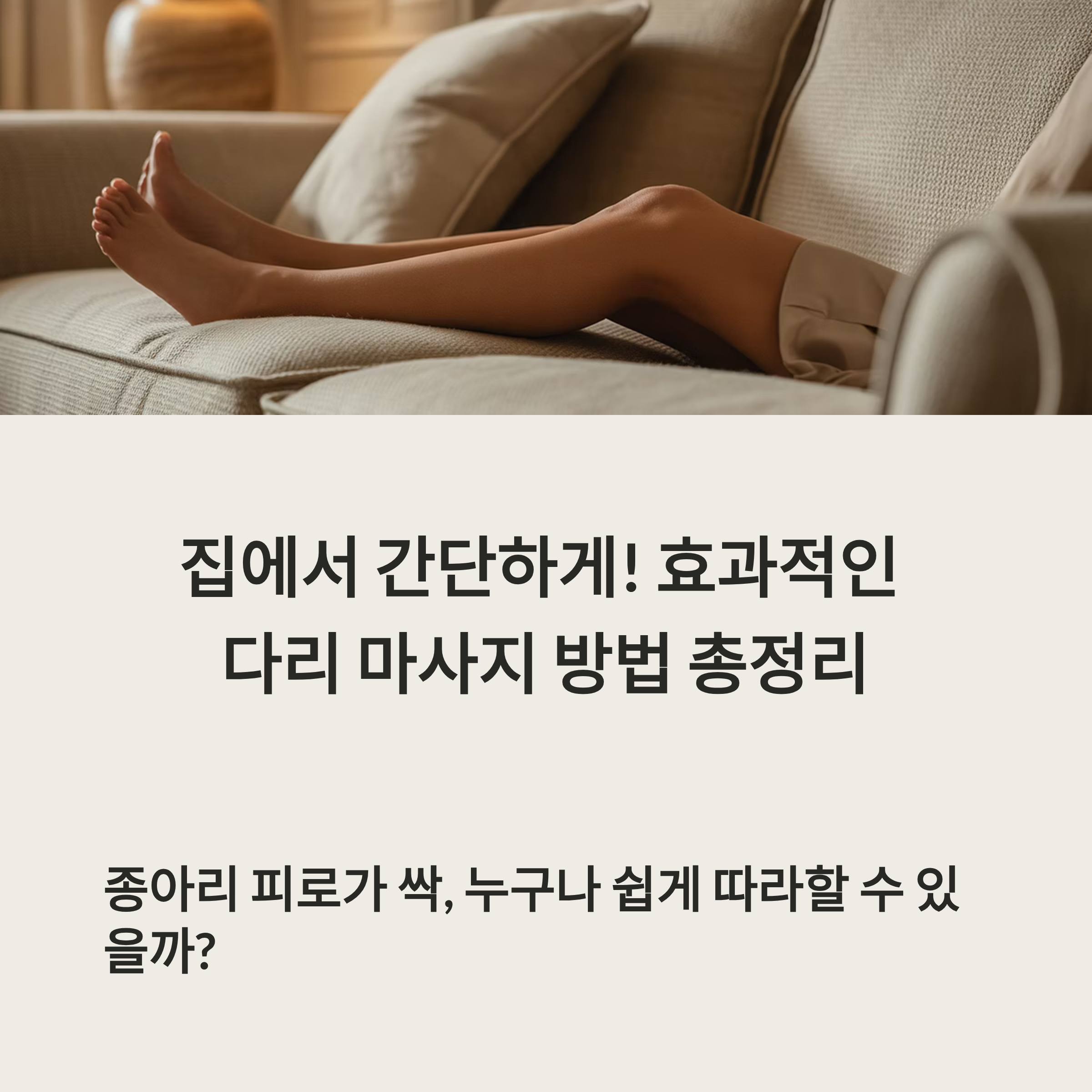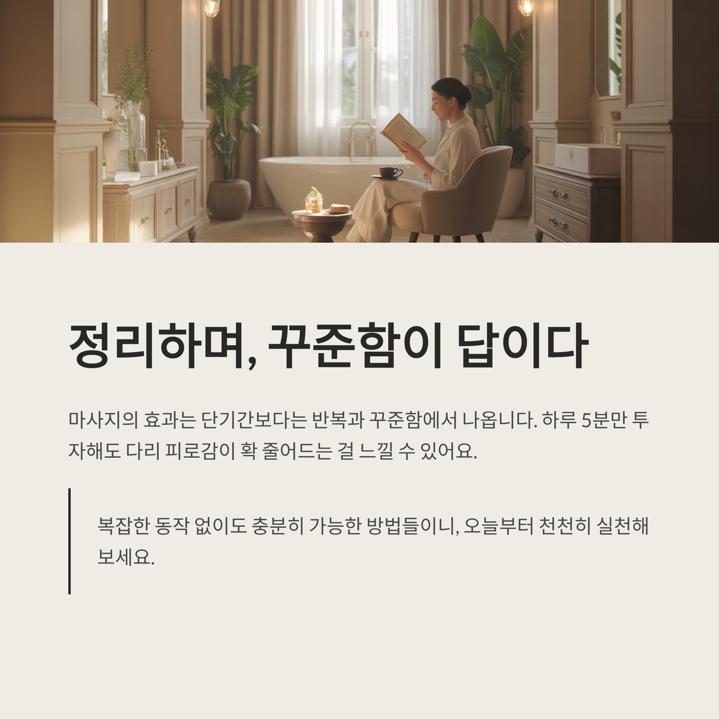 마사지의 효과는 단기간보다는 반복과 꾸준함에서 나옵니다. 하루 5분만 투자해도 다리 피로감이 확 줄어드는 걸 느낄 수 있어요. 복잡한 동작 없이도 충분히 가능한 방법들이니, 오늘부터 천천히 실천해 보세요.