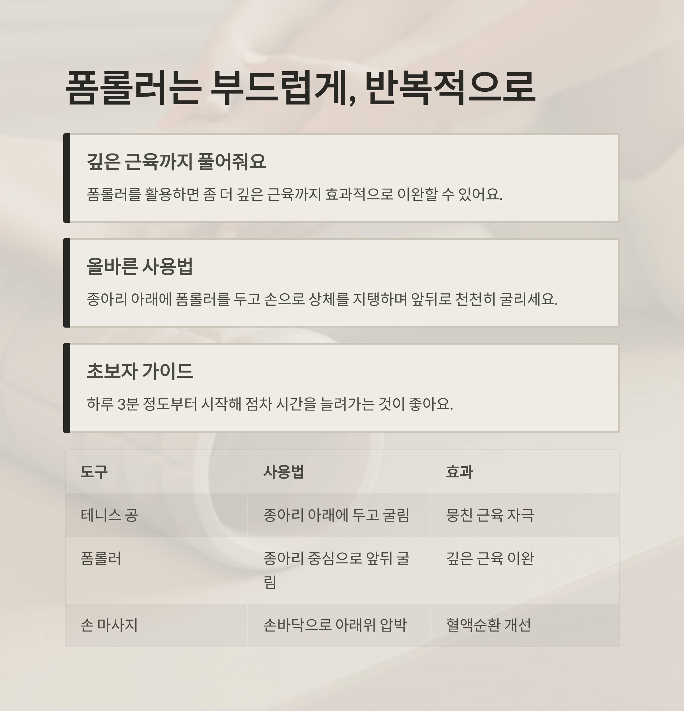 | 폼롤러 | 종아리 중심으로 앞뒤 굴림 | 깊은 근육 이완 |