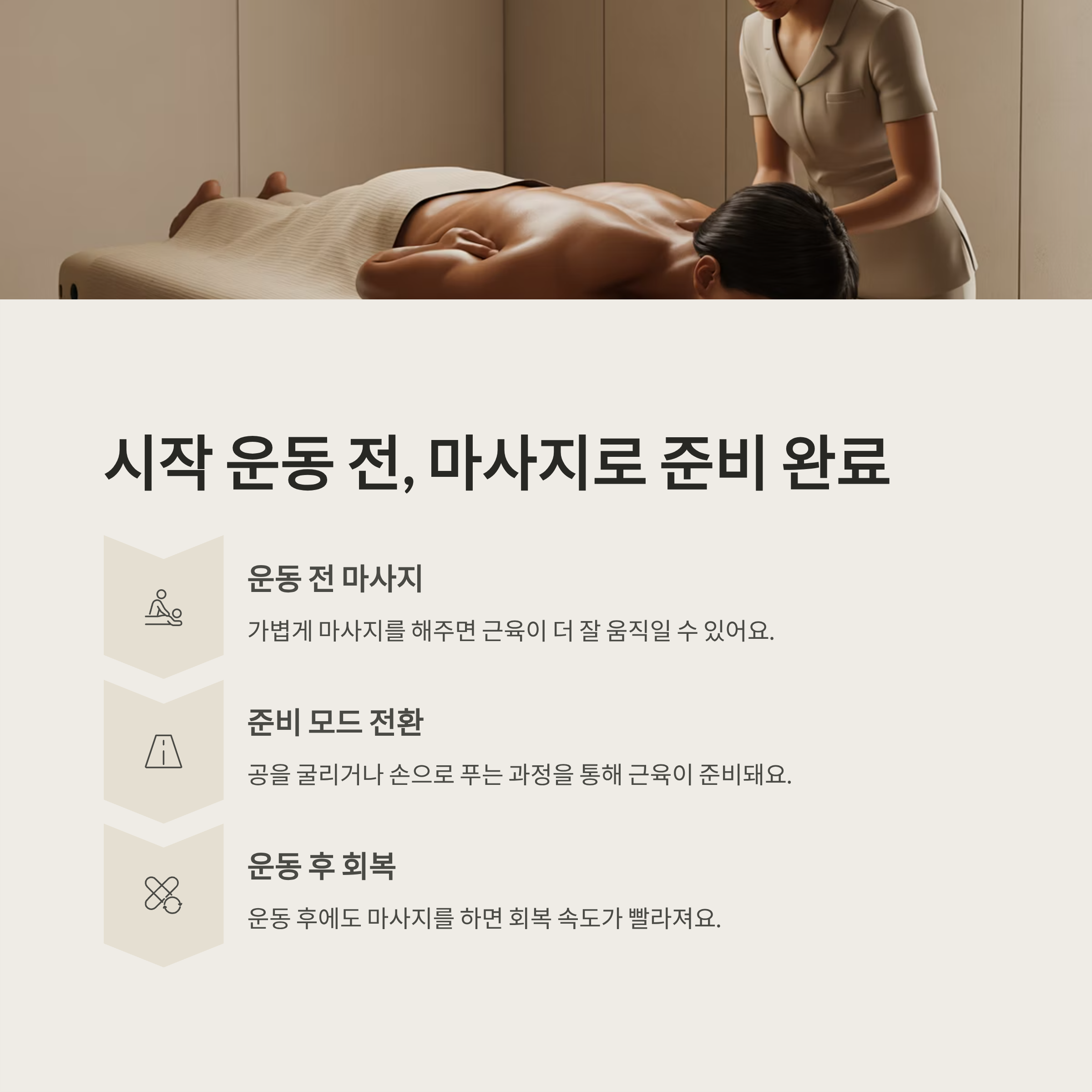 운동 전에 가볍게 마사지를 해주면 근육이 더 잘 움직일 수 있어요.