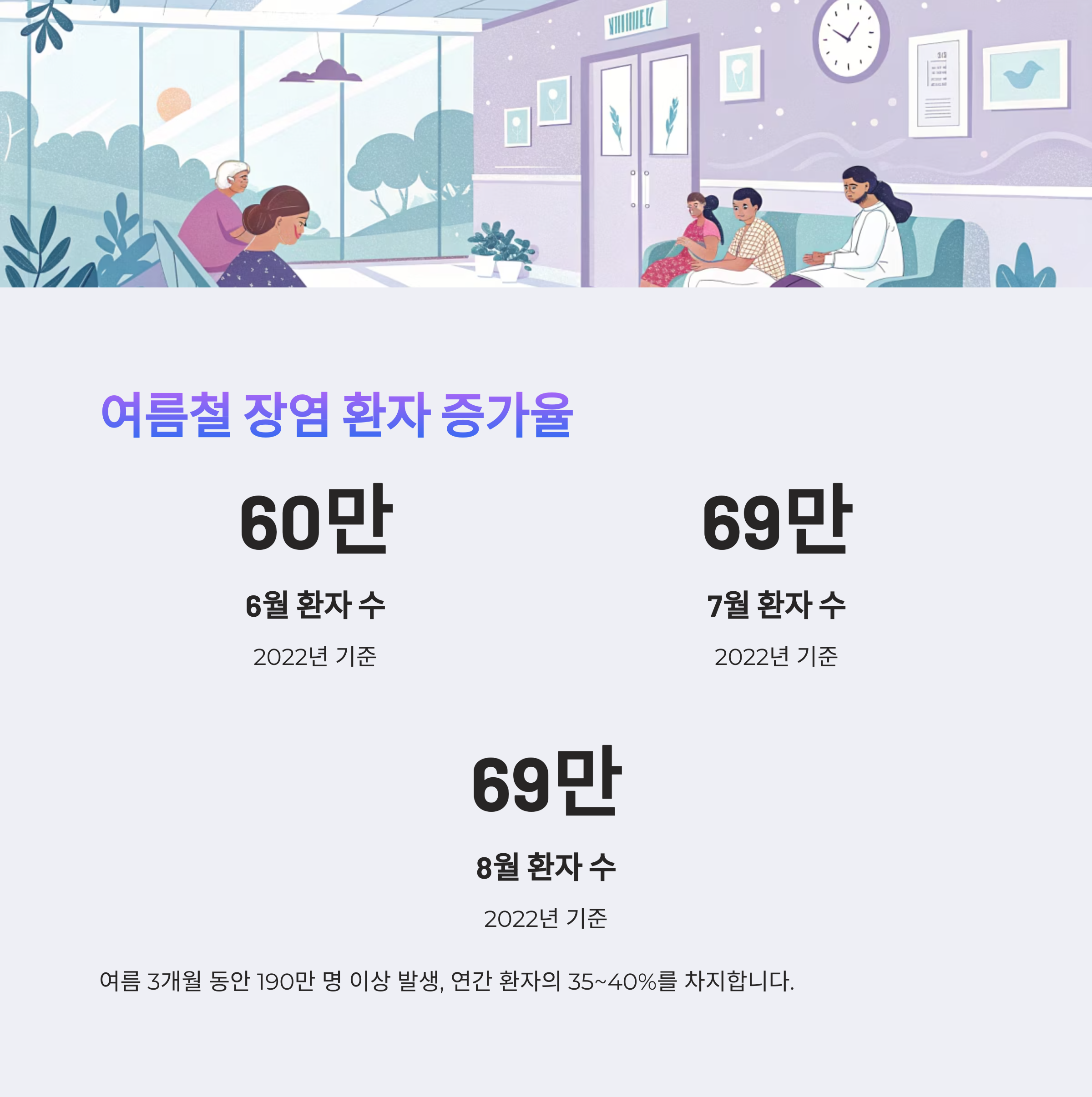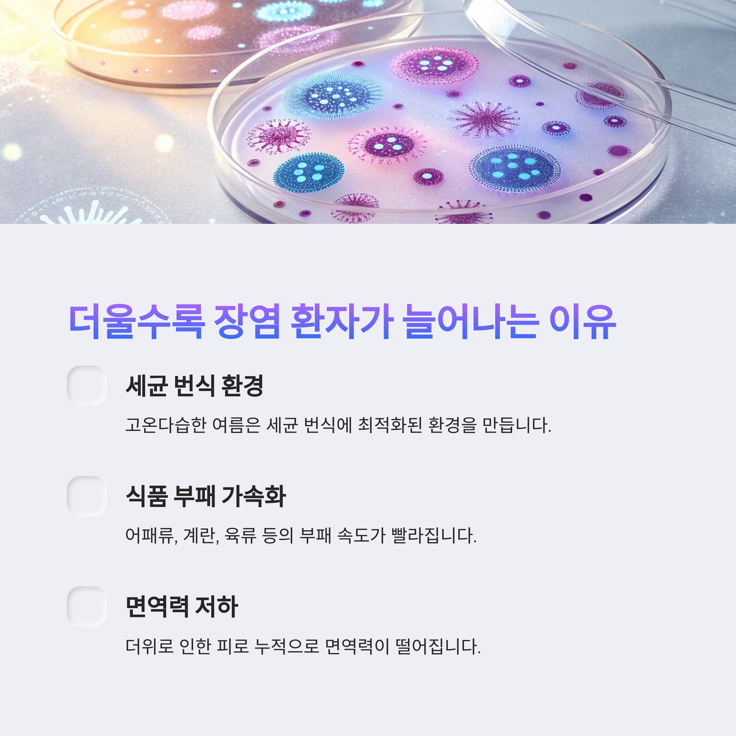 이는 고온다습한 환경이 세균 번식에 최적화되어 있고, 음식 보관이 쉬운 겨울과 달리 여름에는 조금만 방심해도 식중독성 장염으로 이어질 수 있다는 사실을 보여줍니다.
